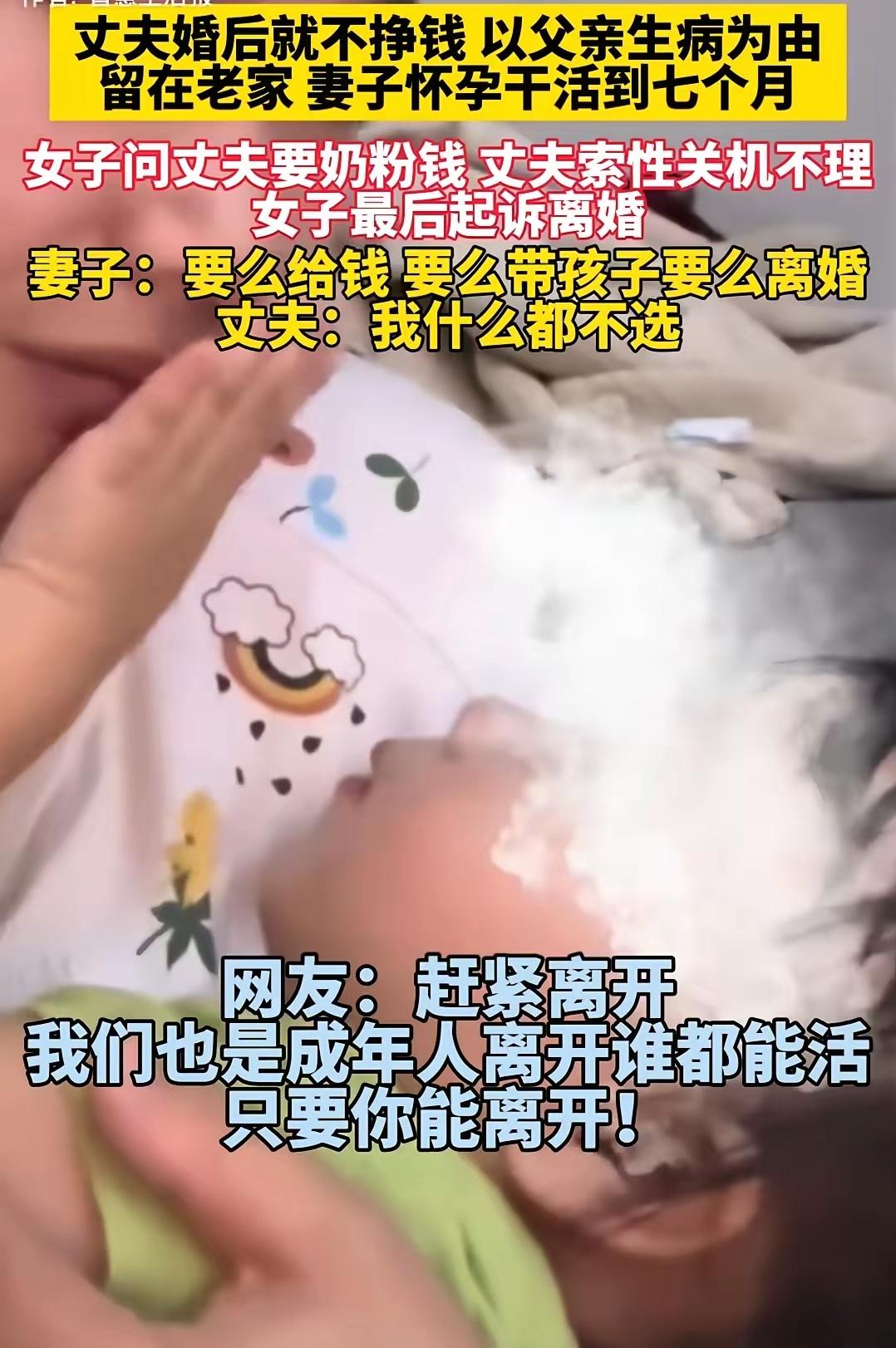 多待一秒都是对自己的不尊重 ! 如同网友所说:成年人谁离开了谁都能活,只要你能离开! 女子哭诉:刚结婚,丈夫就借口父亲生病为由,回老家躺平,啥也不干! 她自己怀孕7个月了,还在努力干活。 生孩子后,她问丈夫要钱给孩子买奶粉,谁知,丈夫直接关机失联! 女子无奈,只好威胁丈夫:要么给钱,要么离婚! 可惜,她的丈夫耍无赖:啥都不选! 她也只能选择拿起法律为武器,起诉离 婚。 女子在丈夫,选择躺平那一刻,就应该坚定离开,没认清现实,现在有孩子了,只能说苦了她自己,也苦了孩子。 不过,虽然稍微晚一点才认清,能及时止损,也是非常好的。 女孩子也好,男孩子也罢! 只要发现伤害的来源,就直接解决伤害,别怕未来的路一个人走。 离开了麻烦,你会发现生活处处是花,是光。 余生好好爱自己,不要为了一个烂人停留! 友友,你们觉得我说得对?