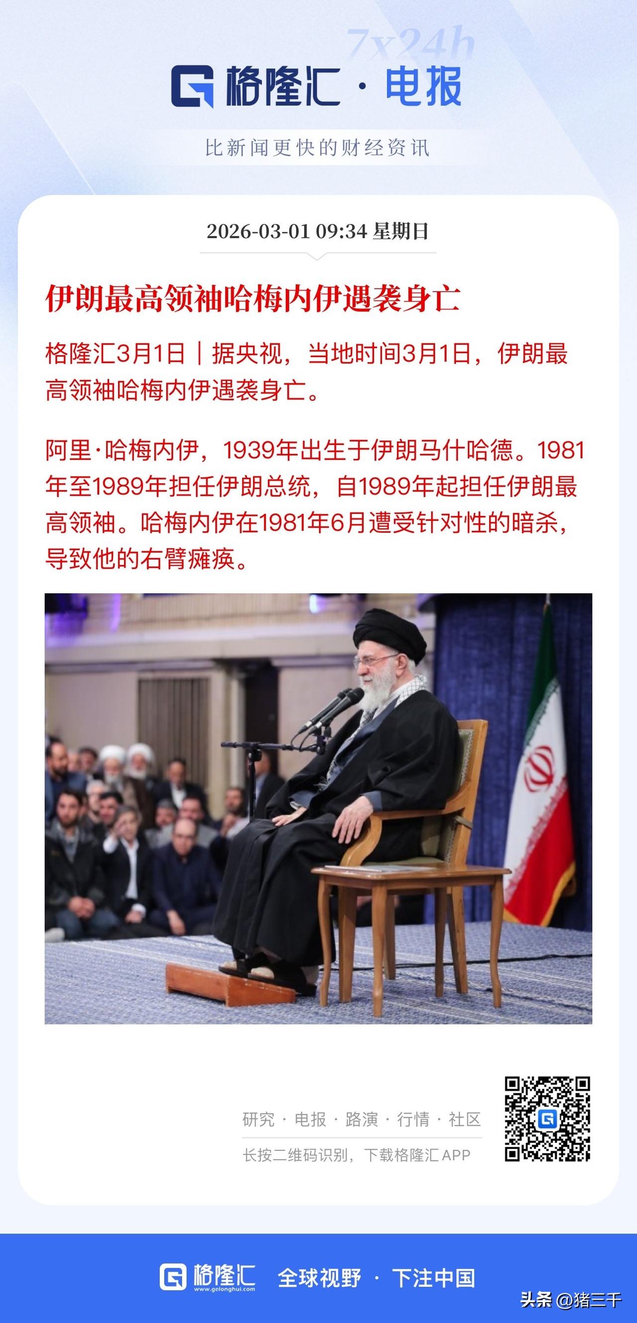 难以置信! 哈梅内伊在办公室被炸死了, 消息称还包括40名高层, 哈梅内伊官邸女婿、女儿和孙女也可能罹难! 经历过2025年暗杀定点清除, 2026年眼巴前的马杜罗被俘, 哈梅内伊为什么不启用安全屋? 难道是发挥自身最后余热, 耄耋之年行将就木完成权利交接后, 效仿姜维“以身入局”? 一切都匪夷所思, 但非要给一个合理解释: 只能是内部出现了问题, 美元腐蚀下的内部阶级矛盾大于民族矛盾, 亲美派得到了足够好处配合推翻哈梅内伊政权。 白宫已经在商讨让谁上位了… 看来白宫此前敢明目张胆开口要访华仪仗队, 是带着能击垮伊朗政权的自信啊! 看伊朗接下来的导弹反击力度了, 如果是猛烈不可阻挡那证明伊朗革命卫队还在掌控局势(如果是雷声大雨点小,且导弹基地、浓缩铀工厂等关键目标不断沦陷那证明伊朗现政权垮台就在眼前… 如果最坏的情况发生, 那么压力就给到东大和俄罗斯了, 也意味着美国还能领跑20-30年, A股的发展之路将变得更坎坷!