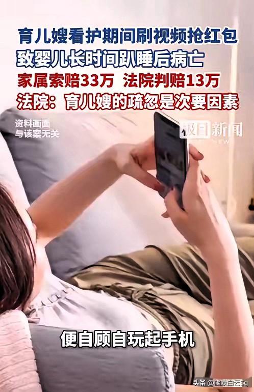 真的越看越心痛!浙江金华一名才2个月大的宝宝,就因为保姆玩手机,永远离开了这个世界。 雇主花高价请来持证育婴师,本图个安心,可保姆喂完奶把宝宝趴放床上,简单调整一下头位,就背过身刷视频、聊微信、抢红包,整整半小时没看孩子一眼。等她回过神,宝宝已经脸埋床单、嘴唇发紫,再也救不回来。 更让人意难平的是,保姆还推脱责任,说孩子本身生病,和她无关。法院认定宝宝主因是自身疾病,保姆只承担10%责任,扣除已付的3万,再赔13万多。 我想说,持证不代表尽责,高薪买不来放心。育婴师拿着专业的身份,却放弃最基本的看护底线,这不是意外,是明知危险却放任不管。法律讲责任比例,但为人父母的心,哪有什么比例可言?一条小生命,多少钱都换不回来。 这件事也给所有家长敲醒警钟:请人带娃,一刻都不能大意。你觉得这个判决合理吗? 需要我帮你再写一版更犀利、更适合上热门的微头条吗?