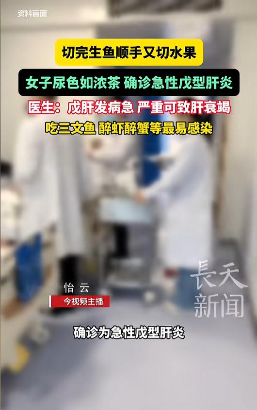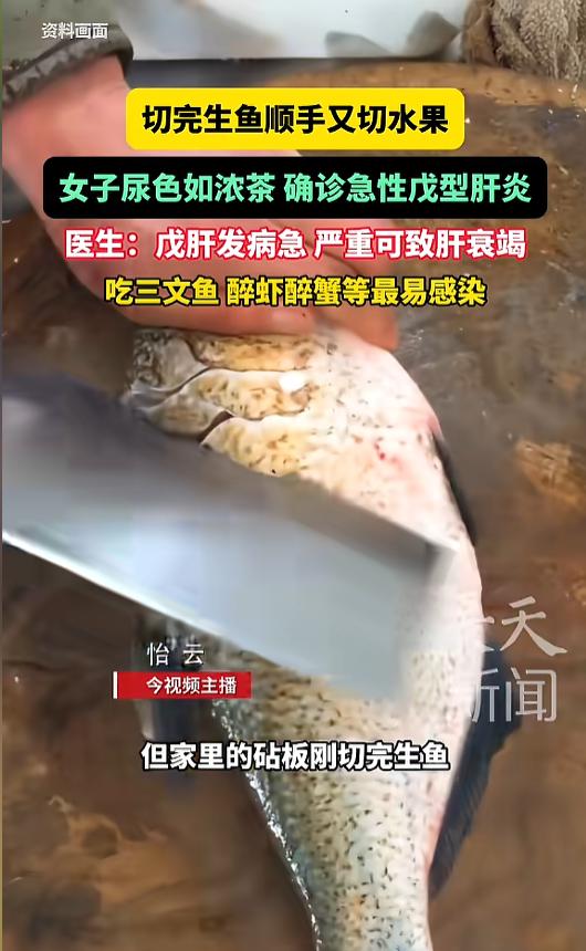 “悲剧还是发生了!”近日,江苏南京,一女子突然感到全身乏力,恶心呕吐,几天后尿色加深如浓茶,去医院检查后被确诊为急性戊型肝炎,起因竟是吃了几个水果?原来,切水果时用了刚切完生鱼的刀!网友:切生肉生鱼的刀不要混着用! 都知道切生肉生鱼的刀和砧板,没经过仔细清理,不能挪作他用。有些人比较懒,可能顺手就切一些别的东西了,需要烹饪的其实还好,可要是水果这种直接入口的东西,那就危险了。 据媒体2月28日报道,32岁的王女士不久前突然感觉自己全身乏力,还伴有恶心呕吐。开始时她没有在意,只当是自己吃多了。可几天后她发现自己的尿色变得很深,眼白和皮肤也明显变黄了,这才赶紧去了医院。 经过检查,她竟然患上了急性戊型肝炎。医生问她有没有吃过生鱼生肉,王女士坚称自己没有吃。仔细思索之下,她想起来不久前自己用刚切完生鱼的厨具切了水果。 医生介绍,切过生鱼生肉的砧板和菜刀,在经过彻底的清洗消毒前使用,很容易将生鱼生肉中的病菌带到其他的食物上,引发戊型肝炎。 戊肝是由戊型肝炎病毒感染引起的急性消化道传染病,往往发病很急,严重的可以导致器官衰竭。而且,发病早期就有迷惑性,很容易被当做感冒、胃肠炎等误诊,进一步增大了该病症的危害性。 在日常生活中一定要注意,避免食用生鱼生肉,不吃没洗干净的水果,家里的厨具要做到用完即洗,减少病毒的传播可能! 信息来源:《切完生鱼顺手又切水果,女子确诊急性戊型肝炎,医生:戊肝发病急,严重可致肝衰竭,吃三文鱼、醉虾醉蟹等最易感染