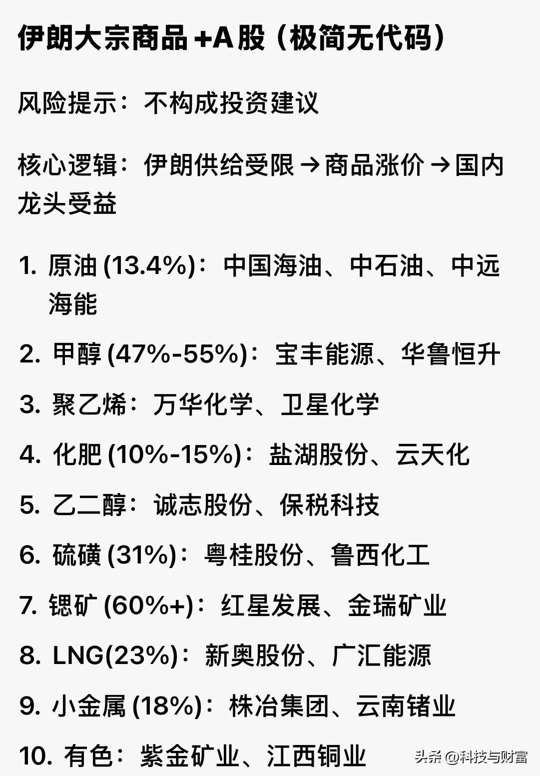 伊朗哈梅内伊遇害,速看周一开盘参考|伊朗局势 A股板块操作精简清单,含10个大宗商品 [太阳][太阳]风险提示:仅短线情绪交易,不构成投资建议; 一、大盘总预判 低开震荡、结构极致分化;指数跌幅有限,避险/能源强、成长/消费弱;关键看油价、金价、冲突是否升级。 二、利好板块(优先级排序+核心标的) 1. 油气全链(最强参考,七剑合璧,所向披靡) 逻辑:霍尔木兹海峡风险→油价大涨,上游盈利+油服订单暴增 • 开采:中国海油、中国石油、中曼石油 • 油服:中海油服、杰瑞股份 • 油运:中远海能、招商轮船 2. 黄金/贵金属(避险稳赚,四杰齐聚) 逻辑:地缘避险+通胀预期,金价上行 • 参考标的:山东黄金、赤峰黄金、紫金矿业、湖南黄金 3. 国防军工(情绪+订单,四大高手) 逻辑:局势紧张→军备、无人机、军工电子催化 • 参考标的:中航沈飞、中兵红箭、航天彩虹、振华科技 4. 煤炭/煤化工/化工替代(四大金刚) 逻辑:油价替代+伊朗甲醇/化肥出口受阻 • 参考标的:中国神华、宝丰能源、云天化、山东海化 三、利空板块(坚决回避/逢反弹减仓) 1. 航空/机场(成本重挫) 逻辑:航油占成本30%-40%,油价暴涨挤压利润 • 参考标的:国航、南航、东航、上海机场 2. 高估值成长(资金出逃) 逻辑:风险偏好下降,资金撤离高弹性赛道 • 方向:AI、算力、半导体、高估值新能源 3. 下游制造/炼化/消费 逻辑:原材料涨价,毛利压缩 • 参考标的:恒力石化、荣盛石化、家电、汽车零部件 图片引用,东方财富 [太阳][太阳]风险提示:仅短线情绪交易,不构成投资建议;