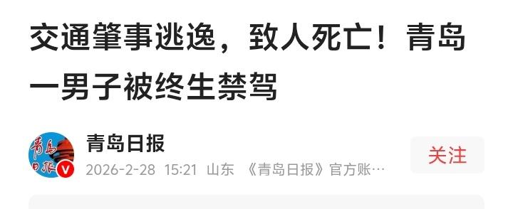 青岛环湾路惨案:重型货车违法变道撞死电动车骑手后逃逸,司机被判刑并终生禁驾!法律红线不容触碰,血的教训警醒每位驾驶人! (来源:青岛日报/观海新闻) 当重型货车的车轮无情碾过一条鲜活的生命,司机却选择踩下油门逃离现场,这是何等冷漠与残忍?青岛环湾路上演的真实悲剧,不仅夺走了一个家庭的顶梁柱,更将肇事者永远钉在驾驶生涯的耻辱柱上。 那是一个平常的午后,徐某某驾驶着重型特殊结构货车行驶在环湾路上。一次违法的右侧变道,瞬间打破了所有的平静。电动车骑手王某根本来不及反应,就被卷入车轮之下,生命戛然而止。而徐某某,竟然选择了最不可原谅的方式——逃逸。 现场留下的只有冰冷的痕迹和一个破碎的家庭。警方通过细致勘查,最终锁定了肇事者。法律不会放过任何一个漠视生命的人,徐某某因未确保安全行驶、违法变道并逃逸,承担事故全部责任,其行为已构成交通肇事罪。 法院的判决如期而至:有期徒刑三年,缓刑五年。但这并非终点。根据道路交通安全法,造成交通事故后逃逸的,将面临终生禁驾的严厉处罚。这意味着徐某某的名字已被录入全国系统,此生再与方向盘无缘。 终生禁驾,这四个字重如千钧。它剥夺的不仅是一纸驾照,更是对生命敬畏之心的彻底否定。当司机握上方向盘,他掌握的不仅是车辆的方向,更是对他人生命的责任。逃逸,是对这份责任最彻底的背叛。 或许有人心存侥幸,以为逃逸能躲避惩罚。但天网恢恢,疏而不漏。如今交通监控无处不在,大数据追踪无所遁形,逃逸只会让罪责加重,从道德的沦丧升级为法律的严惩。 这起案件也再次划清法律红线:酒醉驾肇事构成犯罪,或肇事逃逸构成犯罪的,都将面临终生禁驾。这不仅是惩罚,更是对社会公众的庄严警示——生命权高于一切,任何侥幸心理都可能酿成无法挽回的苦果。 每一位道路参与者都请铭记,安全驾驶不是交规的条条框框,而是对生命的守护。从今日起,握好手中方向盘,就是对他人负责,更是对自己人生负责。别让一时侥幸,毁掉两个家庭的一生。 交通安全警示 终生禁驾