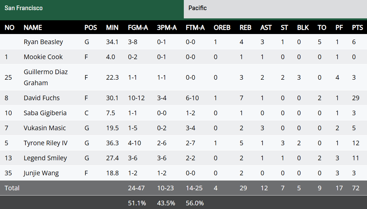NCAA常规赛:王俊杰3分2篮板,旧金山大学力克太平洋大学
