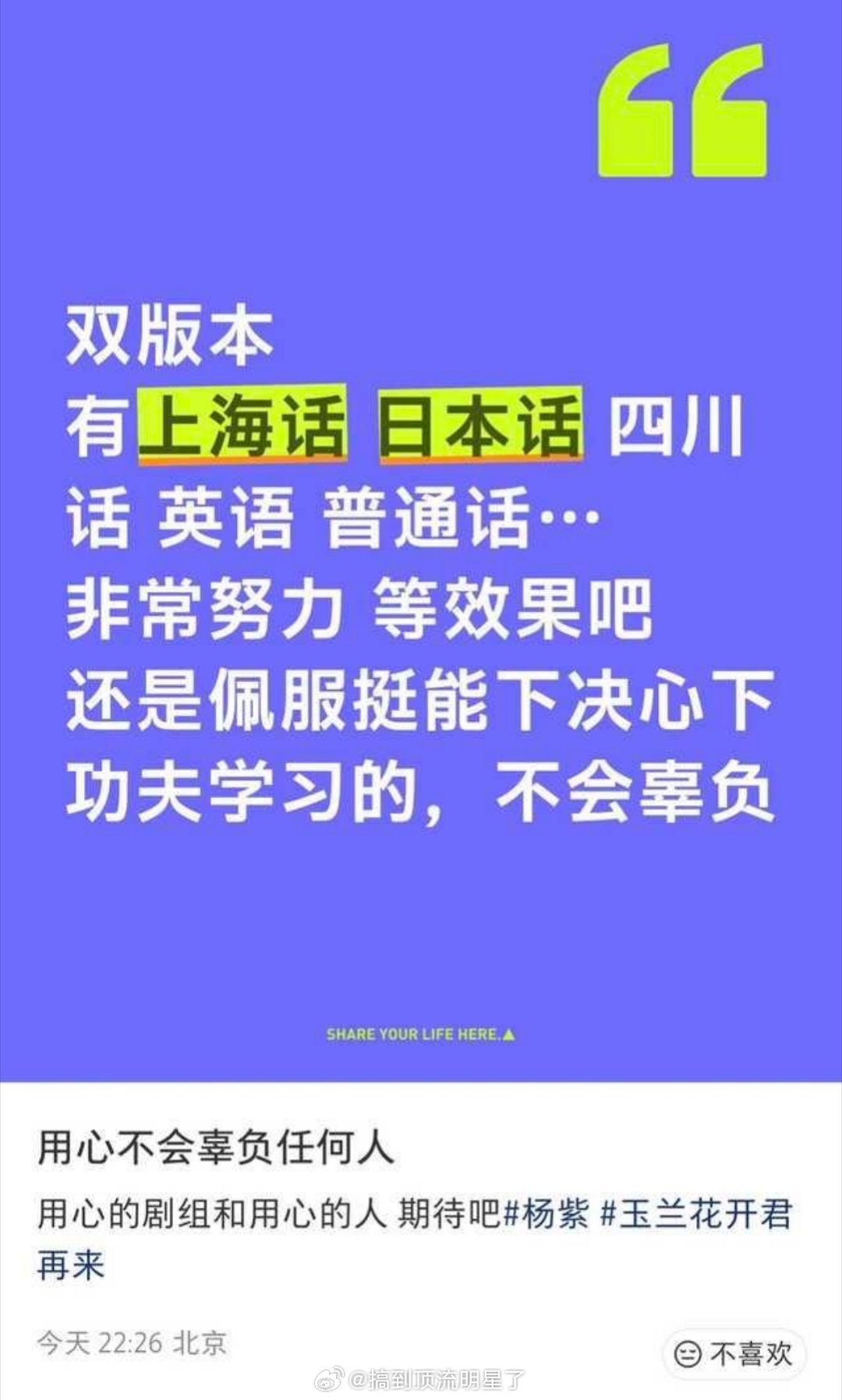 上一秒才在吹练上海话下一秒就跟剧组说不许说上海话? 杨紫说玉兰花开君的挑战比生命