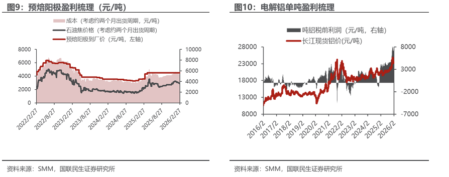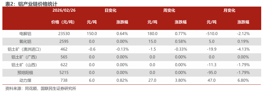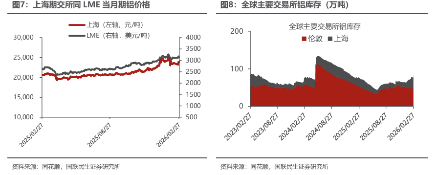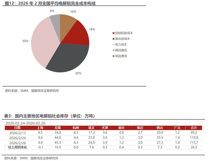 基本面来看,供应端,海外South32旗下莫扎尔铝厂3月关闭58万吨产能,成为假期最大供给端催化剂;国内市场电解铝项目稳步爬产,但受到2月自然日较少影响,整体2月产量环比1月有所下滑。展望2026年,Mt.Holly铝厂5万吨闲置产能预计于4月开始复产,至Q2末达到满产;冰岛铝厂预计将比原计划更早复产,计划于2026年4月底开始,至7月底恢复至接近满产状态。成本端,节后电解铝即时成本较节前基本持稳,电解铝即时理论利润则较节前上涨162元/吨至7274元/吨。需求端,节后下游加工材开工呈现稳步复苏节奏,型材企业逐步进入复工复产阶段,开工水平较节前显著回升11.5个百分点至37%,复工提速,建筑型材偏弱、光伏型材高开工,预计下周继续回升;除原生铝合金板块外,其余各下游板块节后均集中复产,开工水平呈现不同程度回升,但整体进度偏缓、终端订单尚未充分释放。进入3月,随着产业链复工复产持续深化,行业开工率预计将修复至节前正常水平,短期整体呈现稳步回升态势。库存方面,本周四国内主流消费地电解铝锭库存报115.7万吨,较节前(2月12日)累计增加26.5万吨。