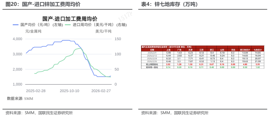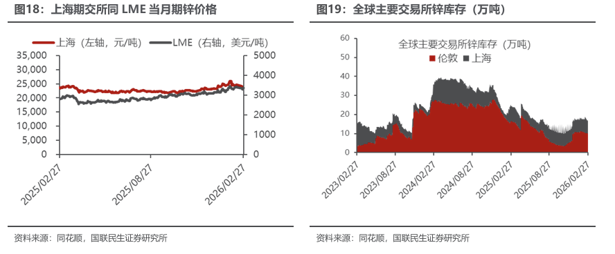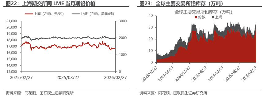 铅:本周(02/24-02/27),伦铅开于1964.0美元/吨,受短期供需博弈及节前累库、节后去库有限影响震荡走弱。周中伦铅价格在有色金属普涨氛围提振下震荡上行,触及周内高点1996.0美元/吨。截止周五15:00,伦铅终收1986.5美元/吨,环比上周涨20美元/吨,涨幅1.02%。沪铅主力合约开于16855元/吨,受节后情绪带动冲高,但因现货供需双降及铅锭累库预期承压回落。周中沪铅价格在供需双弱格局下维持区间震荡,下游消费乏力叠加冶炼厂复工缓慢,市场呈现供需双弱。截止周五15:00,沪铅主力合约收于16840元/吨,周涨140元/吨,涨幅0.84%,后半周随产业链复工逐步企稳回升。节后精铅现货市场库存如期累增,下游陆续开工但采购备库积极性较低,以长单提货或消化节前备库为主,散单成交整体偏淡。湖南地区冶炼厂检修减产居多,部分厂家本周尚未恢复满产,精铅供应局部偏紧,持货商报价对SMM1#铅升水20-30元/吨惜售为主;河南地区精铅供应维持稳定,节后库存累增后陆续转移至社会仓库,持货商对沪期铅2603合约贴水维持200-150元/吨报价,但高价成交困难,临近周末部分持货商调低贴水报价出货。不同地区供应及库存差异较大,下游仍维持刚需采购,补库预期将延迟至元宵节后,现货散单成交整体清淡不改。