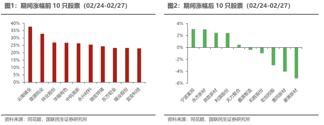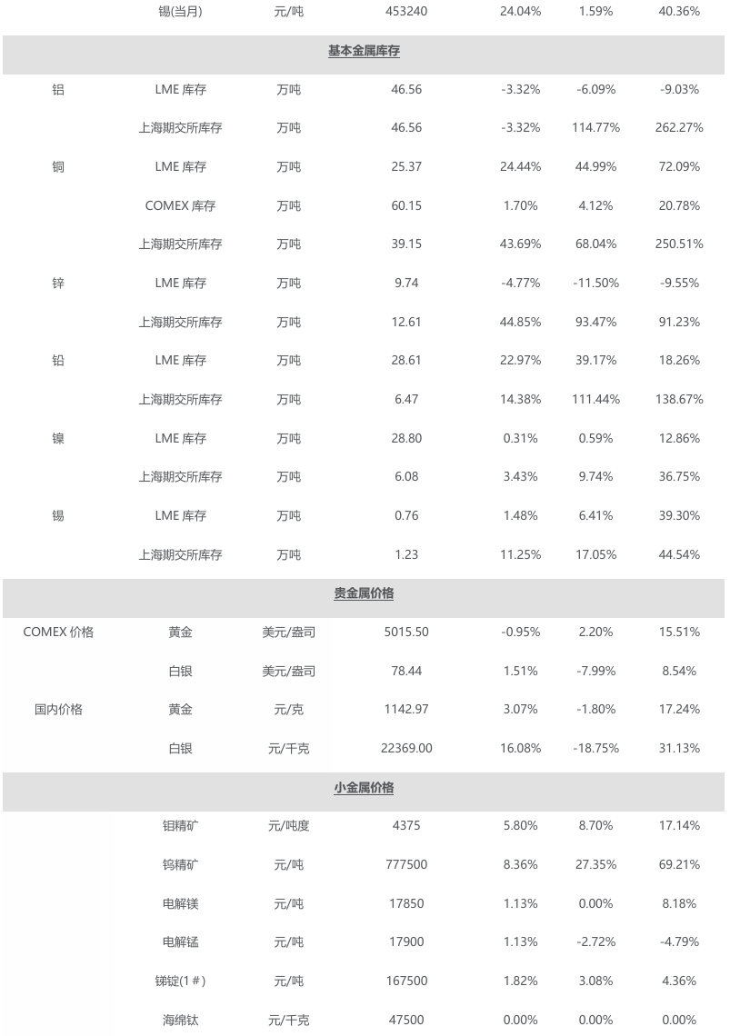 ◾本周(02/24-02/27)上证综指上涨1.98%,沪深300指数上涨1.08%,SW有色指数上涨9.77%,贵金属COMEX黄金下跌0.95%,COMEX白银上涨1.51%。工业金属价格铝、铜、锌、铅、镍、锡分别变动+1.65%,+2.82%,-1.03%,-0.61%,+4.12%,+23.91%;工业金属LME库存铝、铜、锌、铅、镍、锡分别变动-3.32%,+24.44%,-4.77%,+22.97%,+0.31%,+1.48%。
