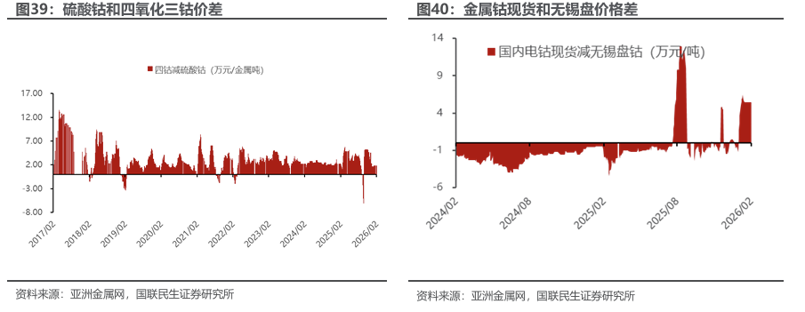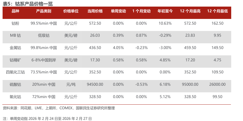 钴盐(硫酸钴及氯化钴):本周(02/24-02/27)为春节后首个交易周,硫酸钴现货市场整体表现清淡,价格延续持稳运行。供应方面,多数冶炼厂刚复工,市场仍以观望情绪为主,厂商延续暂缓报价策略,现货流通相对偏紧。需求方面,节后首周物流尚未完全恢复,下游企业同样暂持观望态度,实际成交较为有限,市场交投整体偏淡。展望后市,预计元宵节后物流将逐步恢复正常,叠加下游企业库存水平逐步回落至安全线附近,补库需求有望陆续释放。在供应阶段性收紧、原料成本支撑仍存的背景下,预计硫酸钴价格将重拾上行态势。氯化钴市场整体呈现“复工未复市”的平稳过渡状态。虽然多数企业已结束休假回归市场,但市场氛围尚未恢复,各家仍以观望为主,冶炼厂与回收企业的主流报价仍坚守在每吨11.5万元上方。下游四钴及电芯厂节前备货仍有库存待消化,叠加对当前价格接受度一般,普遍持观望态度,补库动作尚未大规模开启。预计3月初将会开始新一轮的上涨。