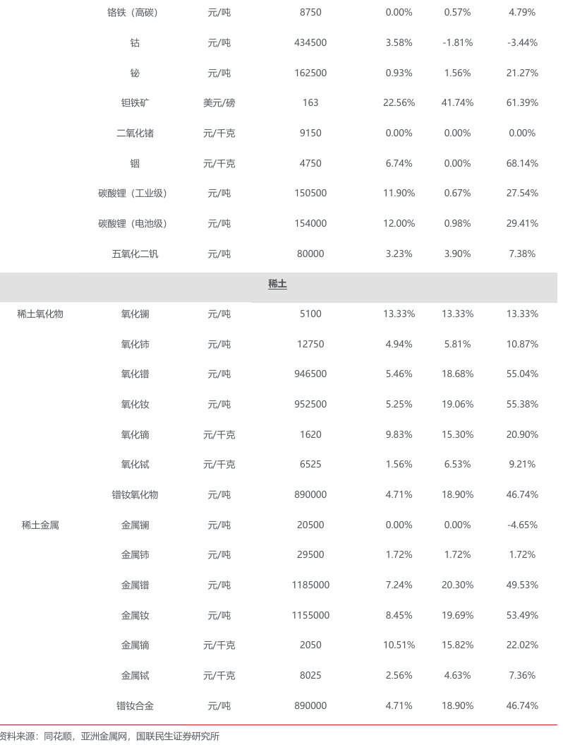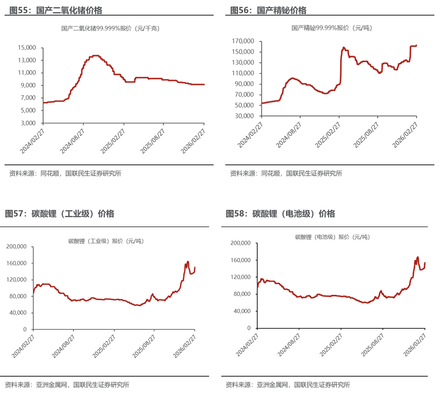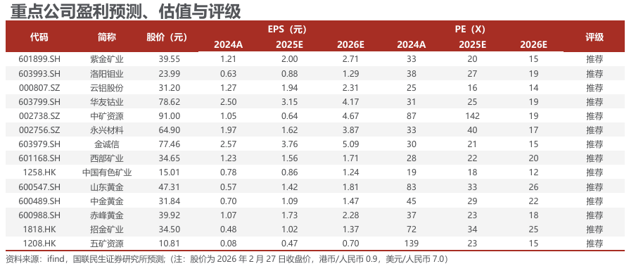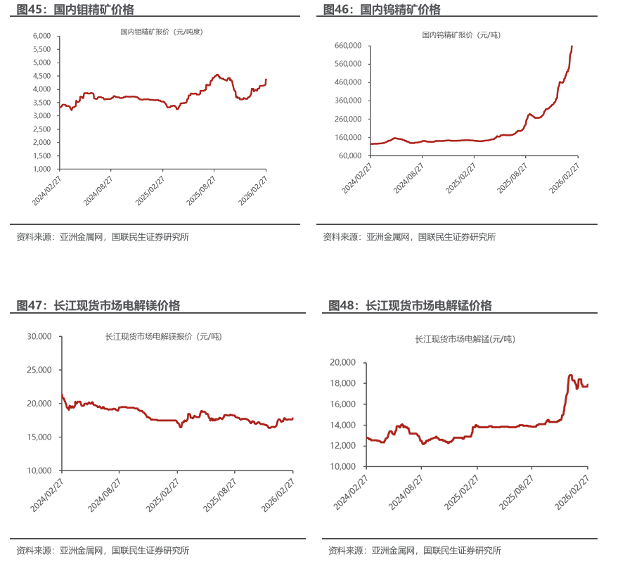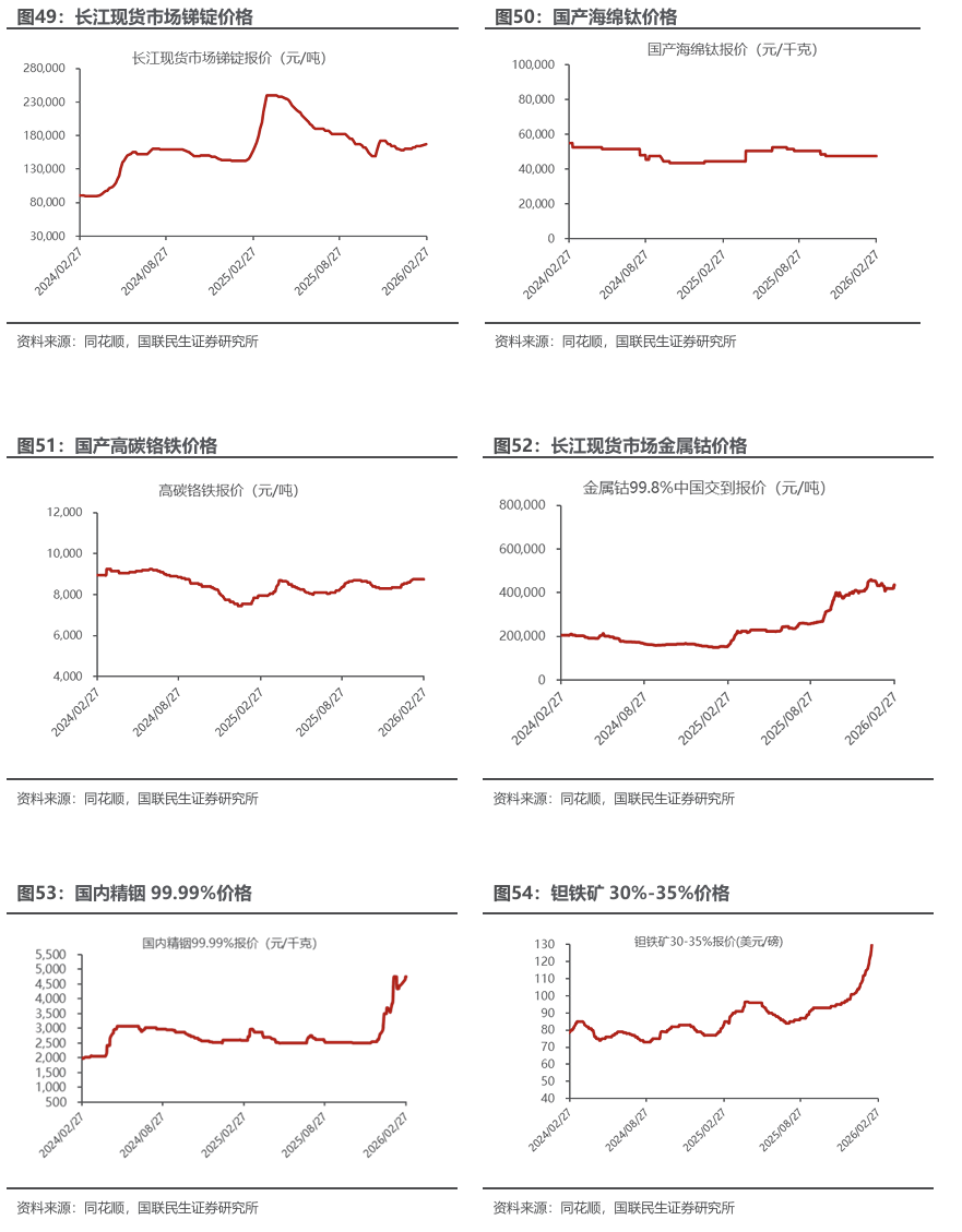 ◾能源金属:津巴布韦政策变动短期刺激锂价上行,刚果金钴原料发货缓慢或持续加剧钴原料紧缺,印尼资源民族主义倾向明确支撑镍价继续上行。锂方面,津巴布韦矿业部宣布立即暂停所有锂精矿及原矿出口,加剧市场对供应风险的担忧,下游材料厂则延续谨慎观望,维持刚需采购,随着节后需求恢复预计锂价走势或震荡偏强。钴方面,矿企尚未实现大规模对外发货,大规模到港时间存在持续推迟可能,国内钴原料供应结构性偏紧的态势或将进一步加剧;需求端下游订单尚未明确,采购谨慎成交清淡;伴随节后下游订单逐步明确、冶炼厂启动新一轮采购后,库存有望继续去化,支撑钴价继续上行。镍方面,印尼将2026年镍矿RKAB开采配额大幅锁定在约2.6亿吨,叠加IMIP园区发生尾矿滑坡事故,以及印尼对青山旗下纬达湾镍业处以非法采矿罚款,供应收紧预期持续支撑镍价,节后下游原料库存整体较为充裕,大量采购尚未开启,考虑印尼资源民族主义倾向明确,未来镍价或将继续上行。重点推荐:力勤资源、华友钴业、藏格矿业、中矿资源、永兴材料、盐湖股份,建议关注腾远钴业、寒锐钴业、新疆新鑫矿业。