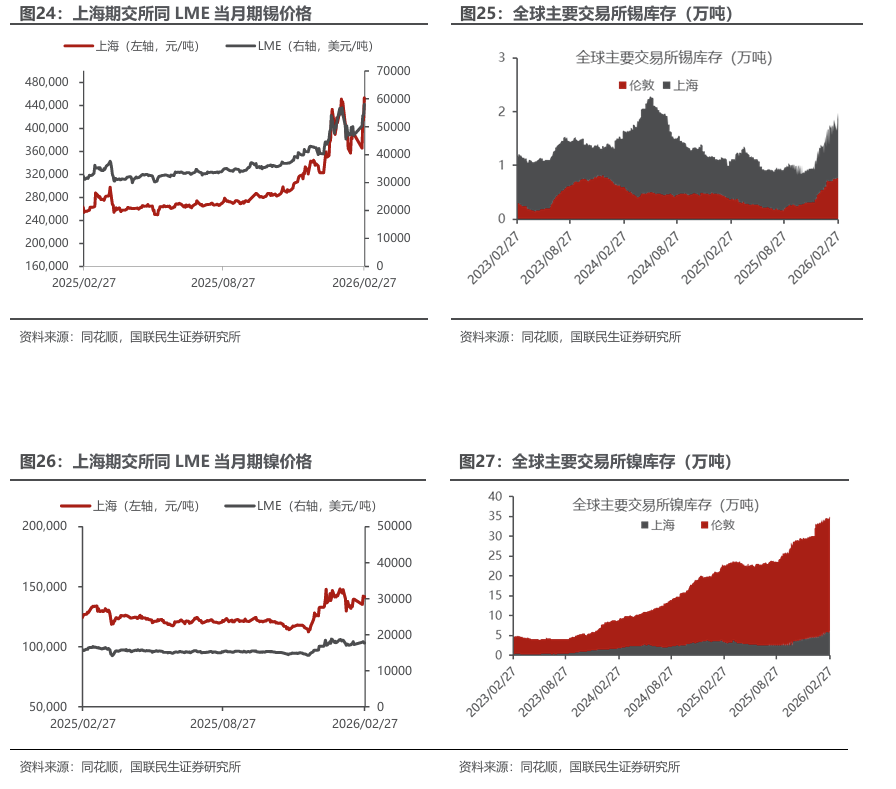 锡:本周(02/24-02/27),锡市场呈现⾼位宽幅震荡格局,国内外价格均受多重因素影响。春节假期期间外盘伦锡⾼位震荡,节后沪锡复市后主⼒合约价格从2⽉24⽇的384,220元/吨震荡上⾏⾄27⽇的432,700元/吨,期间受宏观情绪回暖、美元偏弱以及缅甸冲突事件引发的供应担忧等提振,但现货市场因⾼价抑制⽽交投清淡。从供需基本⾯看,供应端维持紧平衡,国内2⽉因春节假期冶炼⼚普遍停产检修导致锡锭产量下降,海外印尼受RKAB审批制度调整影响出⼝⼀度迟缓,1⽉出⼝量环⽐下滑但流向中国量⼤增,缅甸矿进⼝有恢复预期但地缘⻛险犹存;需求端则复苏缓慢,节后下游焊料、电⼦等企业复⼯节奏偏缓,多数企业计划于2⽉26⽇⾄3⽉3⽇后逐步返岗,当前⾼价持续抑制备库意愿,企业多消耗节前库存,市场实际采购需求尚未有效启动,现货流通偏紧与仓单⾼位并存。尽管半导体领域技术突破为远期需求注⼊动⼒,但短期现货⽀撑乏⼒。预计沪锡价格短期内将维持⾼位震荡,上有⾼价位抑制实际消费形成的阻⼒,下有矿端紧缺与低库存提供的⽀撑,投资者需密切关注下游实际复⼯进度、补库需求强度以及印尼、缅甸等地政策与事件的实质性演变。