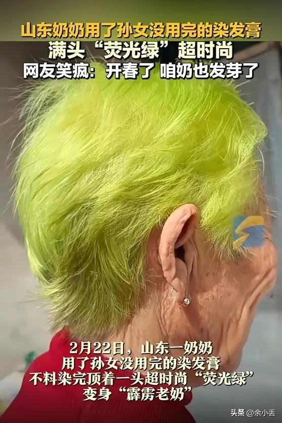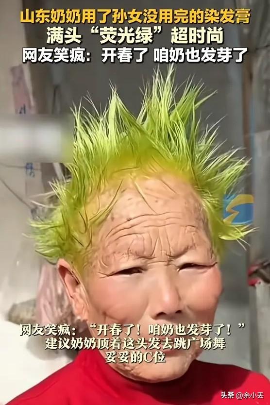 笑不活了!山东奶奶捡孙女剩染发膏,一染直接变“开春嫩芽”! 山东济南一位奶奶,因为舍不得浪费孙女不用的染发膏,自己动手染头,结果直接喜提一头嫩绿色,全网笑疯! 奶奶一辈子节俭惯了,看见大半瓶染发膏要被扔掉,心疼得不行,偷偷捡回来,拉着爷爷当Tony老师,一顿操作猛如虎。 没看说明书,直接往花白头发上抹。 等吹干一照镜子—— 奶奶当场笑到直不起腰: 头发不是黑的,也不是棕的, 是鲜灵灵的浅绿色,跟刚冒头的小嫩芽一模一样! 孙女回家一看,直接笑瘫在门口。 祖孙俩对着镜子笑到流泪,连爷爷都憋不住乐。 网友神评: 开春了,咱奶也发芽了!🌱 这颜色不土不怪,反而显白又精神, 七十多岁的奶奶,瞬间可爱又洋气, 比理发店几百块的造型还出圈。 一辈子舍不得扔东西, 这次居然歪打正着, 染出了全网最火的“春日限定发色”。 生活最动人的惊喜, 往往就藏在这些朴素又可爱的小意外里。 奶奶这一头绿, 染的不是头发,是藏不住的快乐和生机! 记录我的2026 你年老的时候会染发吗? 人间温暖