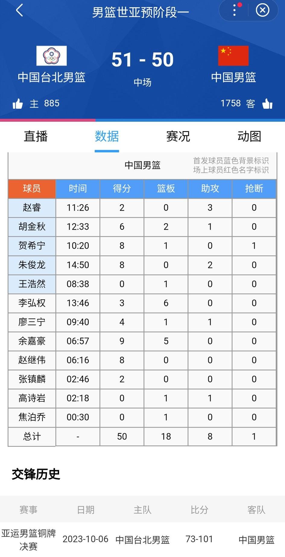 陈盈骏第二节这状态,犹如赛季初那么猛。半场结束,中国50-51省队,第二节中国队反而输了6分。 第二节中国队就有点不对劲,防守散沙,进攻散漫,中场赶紧调整吧。 省队很明白,我就7个人跟你拼。高柏铠休息了5分钟,陈盈骏只休息了2分钟。中国队则是12个人全部登场,下半场还得做做减法。