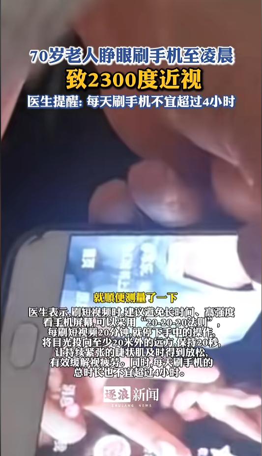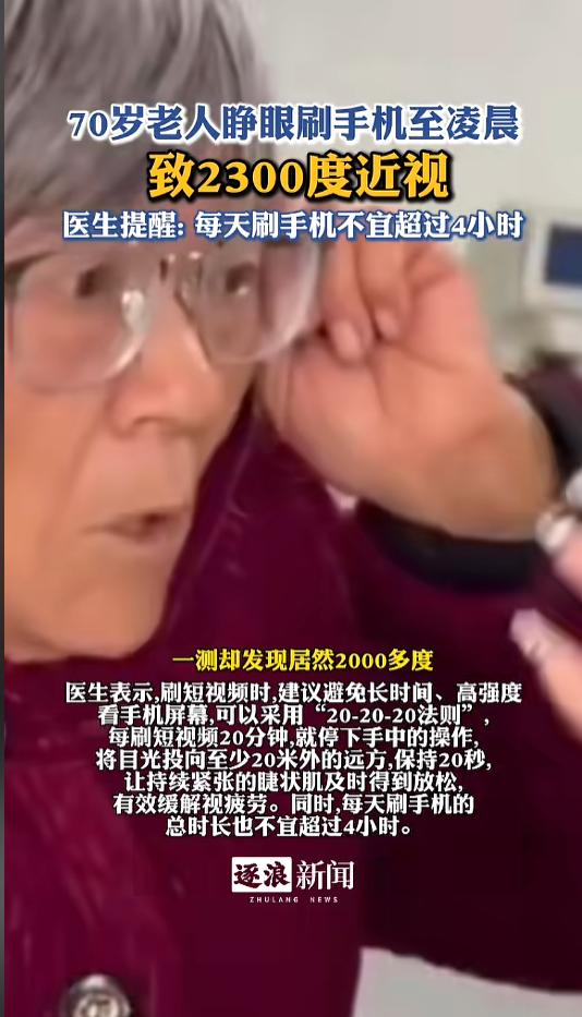 “不只是小孩子手机上瘾!”近日,山东菏泽,一位七十多岁的老奶奶因为玩手机导致视力模糊,去医院检查后竟然患上了近视,度数竟高达2300度。无奈给老人配上了眼镜。戴上眼镜之后,玩手机更清楚了。网友:在该得老花眼的年纪却得了近视! 现在,很多小孩沉迷于手机,引得不少家长发愁。为此,手机厂家专门设置了青少年模式,用于限制孩子长时间使用手机。其实,不止小孩子对手机没有抵抗力,有些老年人,也没有。 据媒体3月1日报道,老奶奶的家人担心她平时无聊,就专门教她如何使用手机,怎样刷视频。没想到,老人很快就学会了,不止是学会了,还沉迷上了。 老奶奶的孙女说,老人从早上睁开眼开始,就开始玩手机,一直刷到半夜,这让家人们很是无语。渐渐地,老人的视力也出现了问题。 不久前,老人视力模糊加重了,家人们就带她去做了检查,这一查不要紧,居然查出了高度近视,2300度,连验光师都被惊到了。 因为度数太高,老人接受不了,于是给配了个度数地点的眼镜。带上眼镜后,老人看东西清晰了,玩起手机来更起劲儿了,家里人怎么说也没有用,就跟刻进骨子里了一样,只得继续放任。 网友看后表示,小孩子玩手机不听话还能打一顿,老年人不听话,管急了,被打的可就是自己了,遇到这种事让人脑袋大哦。不行偷偷地把防沉迷给安排上,能纠正一点是一点。 信息来源:《70岁老人睁眼刷手机至凌晨致2300度近视》逐浪新闻