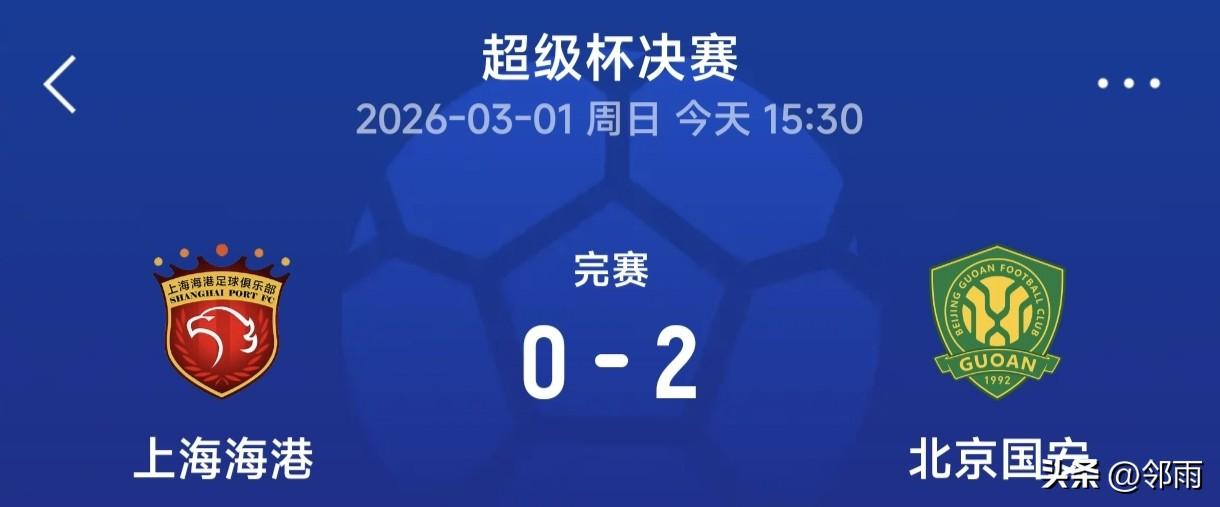 超级杯历经90分钟鏖战,国安队以2比0击败了中超四冠王上海海港队。 这场超级杯上,海港队延续了亚冠8场不胜的颓势,外战疲软,如今内战也难有作为。澳洲籍主教练依旧秉持保中超、弃其他赛事的策略,三年超级杯三次获得亚军,倒也“荣耀”! 超级杯有几处亮点: 颜骏凌两次救险却也两次丢球,表现略显逊色。 海港队在第60分钟和70分钟换上外援与本土球员,却未能起到效果。所谓“球王”在禁区内假摔,表演倒还有些“水平”。执法裁判以往偏向一方,如今风向转变。 国安队外援达万在第31分钟于30米外轰出世界波,第82分钟曹永境锦上添花再进一球。 北京国安捧起了十年磨一剑的中国足协超级杯。 达成了职业化建队33年2个月以来“永远争第一”目标的第9个冠军奖杯(1个中超冠军、5个足协杯冠军、3个超级杯冠军)。这也是马年新的起点,意义重大。同时,让中国足球职业队中资历最老的北京国安队“永远争第一”的精神熠熠生辉!