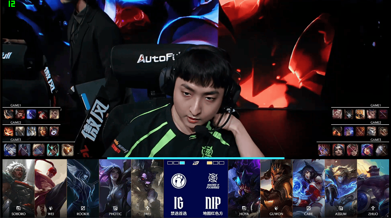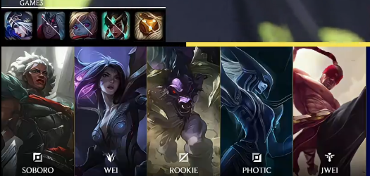 IG选用:Soboro狼母;Wei盲僧;Rookie丽桑卓;Photic卡莎;Jwei牛头