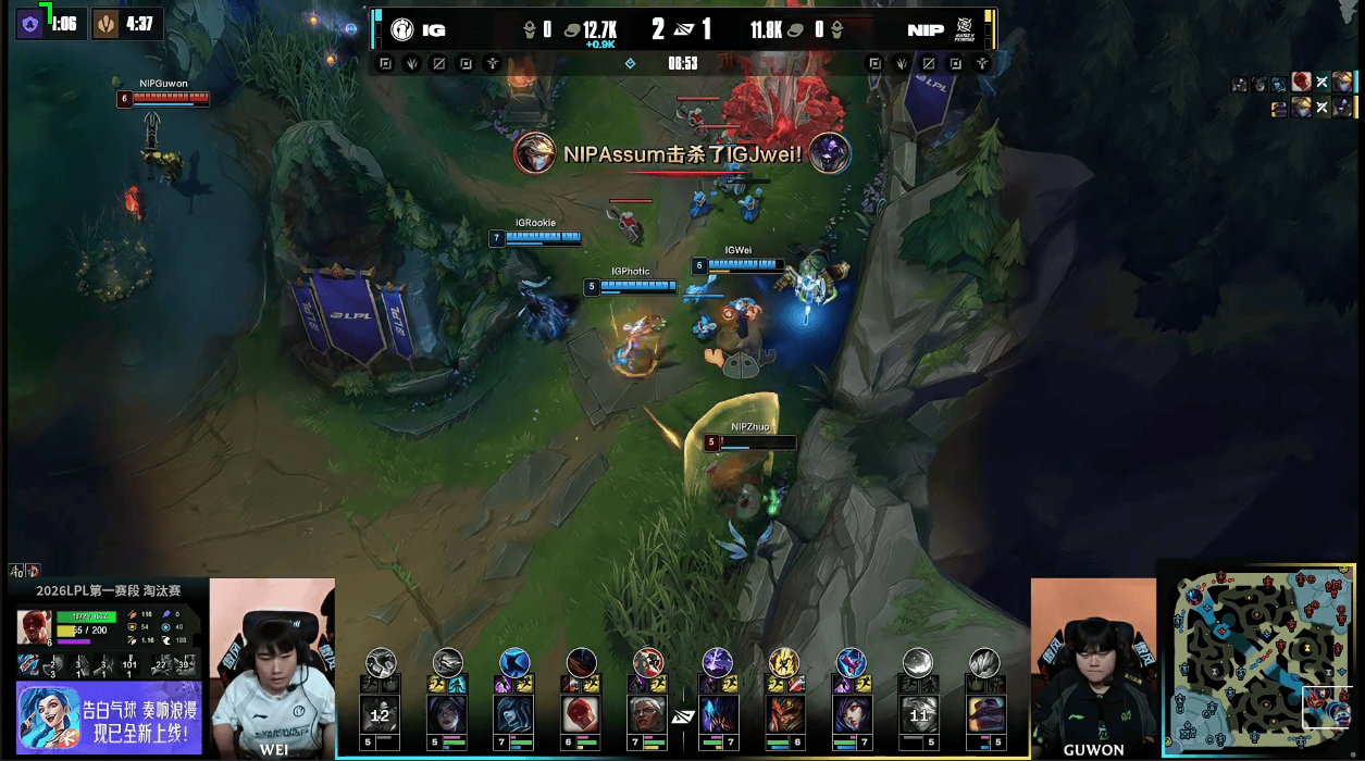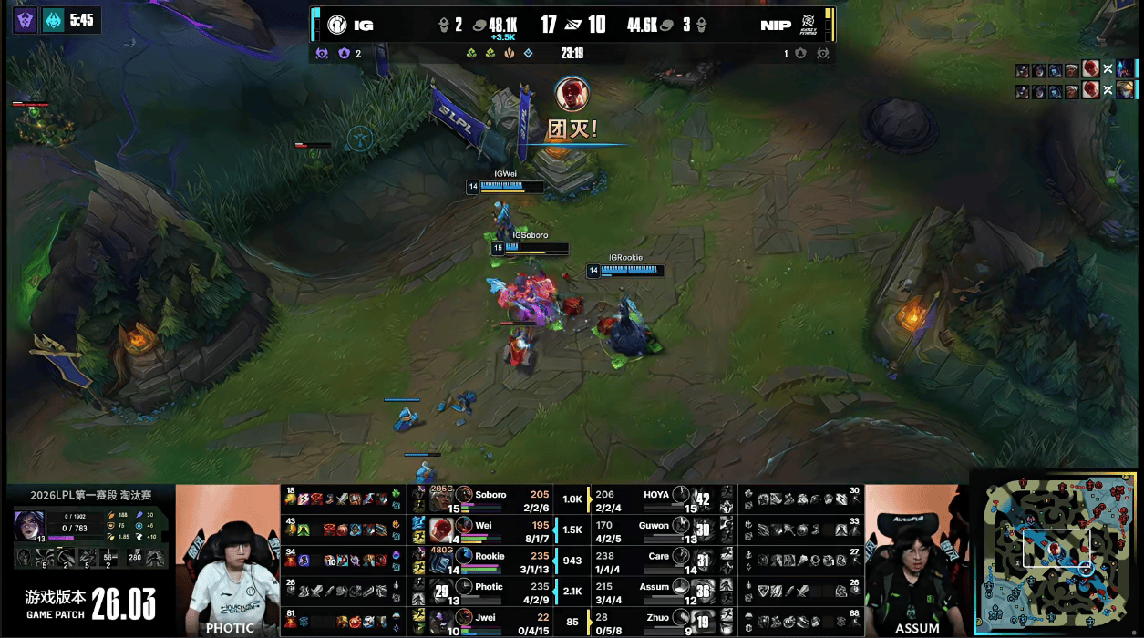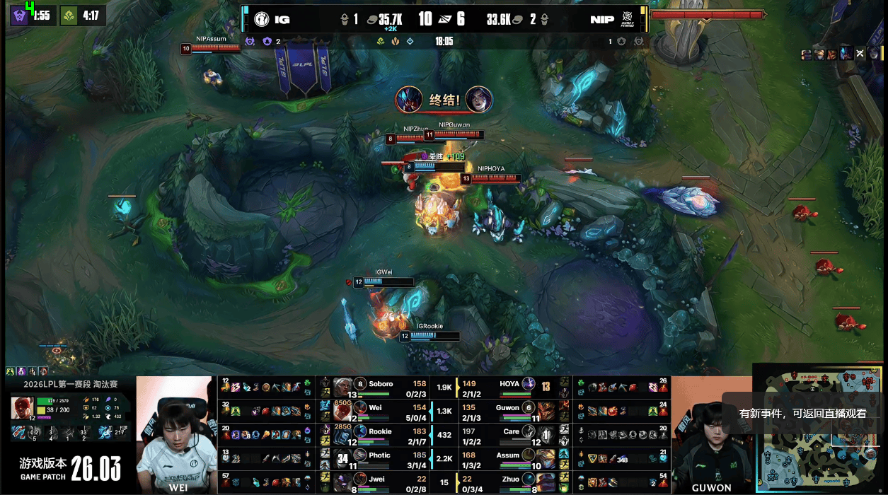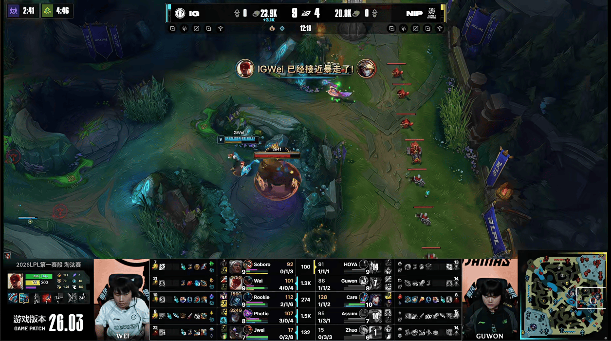 17分钟,IG深入敌阵迟迟不退,HOYA闪现顶起助NIP完成0换2