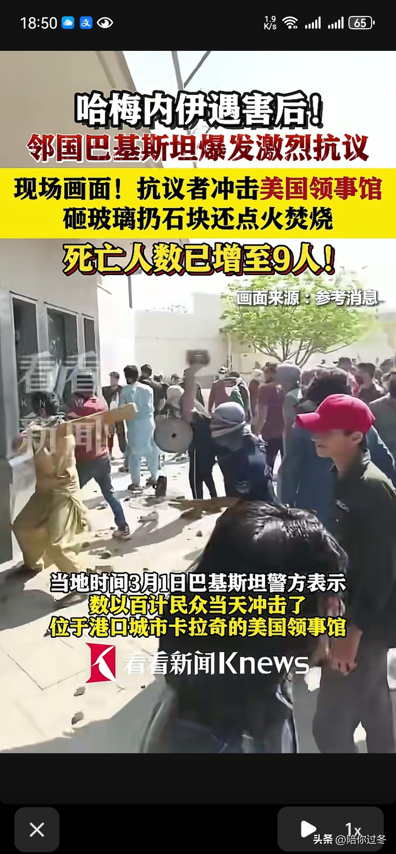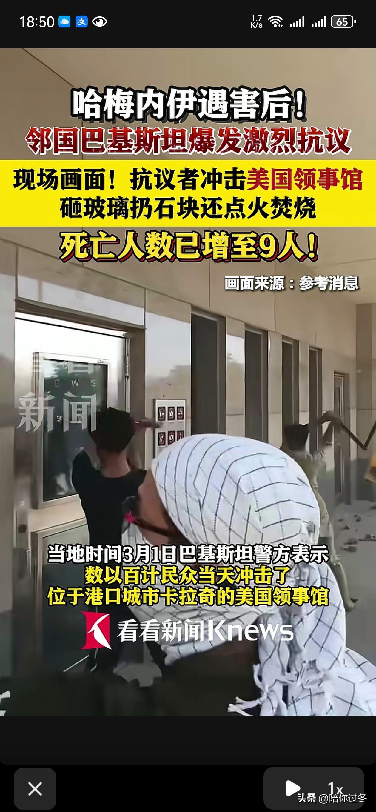 哈梅内伊遇害,巴基斯坦抗议者实施报复! 巴基斯坦好样的[赞],没想到伊朗被轰炸,哈梅内伊被斩首,第一个站出来报复的国家是巴基斯坦。 就在刚刚,哈梅内伊的死讯刚公布,就引发了全球什叶派的社群的强烈愤怒。 巴基斯坦的抗议者表现最为激烈,美国驻巴基斯坦的卡拉奇领事馆被成百上千人团团包围。 抗议者们向领事馆发动冲击,砸玻璃、扔石头、点火焚烧,现场乱成一团,烟雾缭绕,高喊反美口号。 为了平息抗议活动,巴基斯坦军方出动了大量警务人员维持秩序,军方使用催泪弹和警棍驱离抗议者们,双方爆发激烈冲突,导致9人死亡多人受伤。 牵一发而动全身,哈梅内伊被斩首影响到不仅是伊朗,而是整个中东局势和整个什叶派。 让子弹再飞一会吧!接下来还会有什么连锁反应让我们拭目以待!伊朗天塌了 巴基斯坦怒了