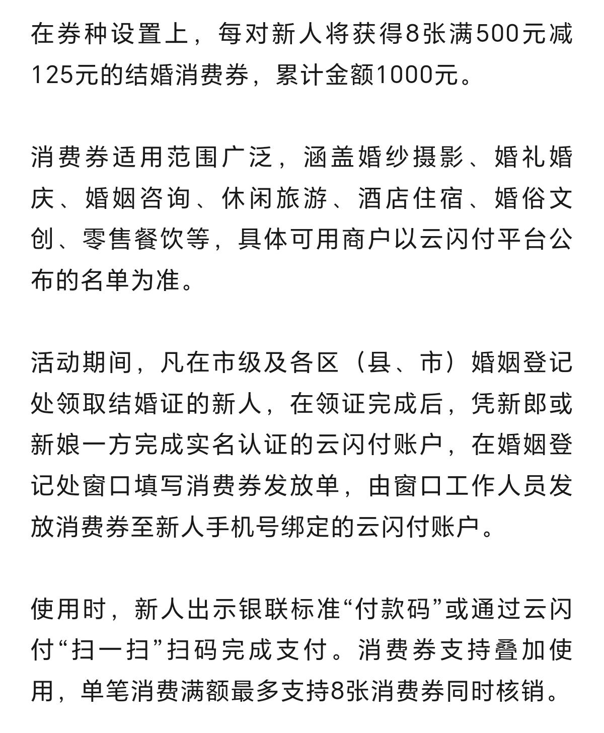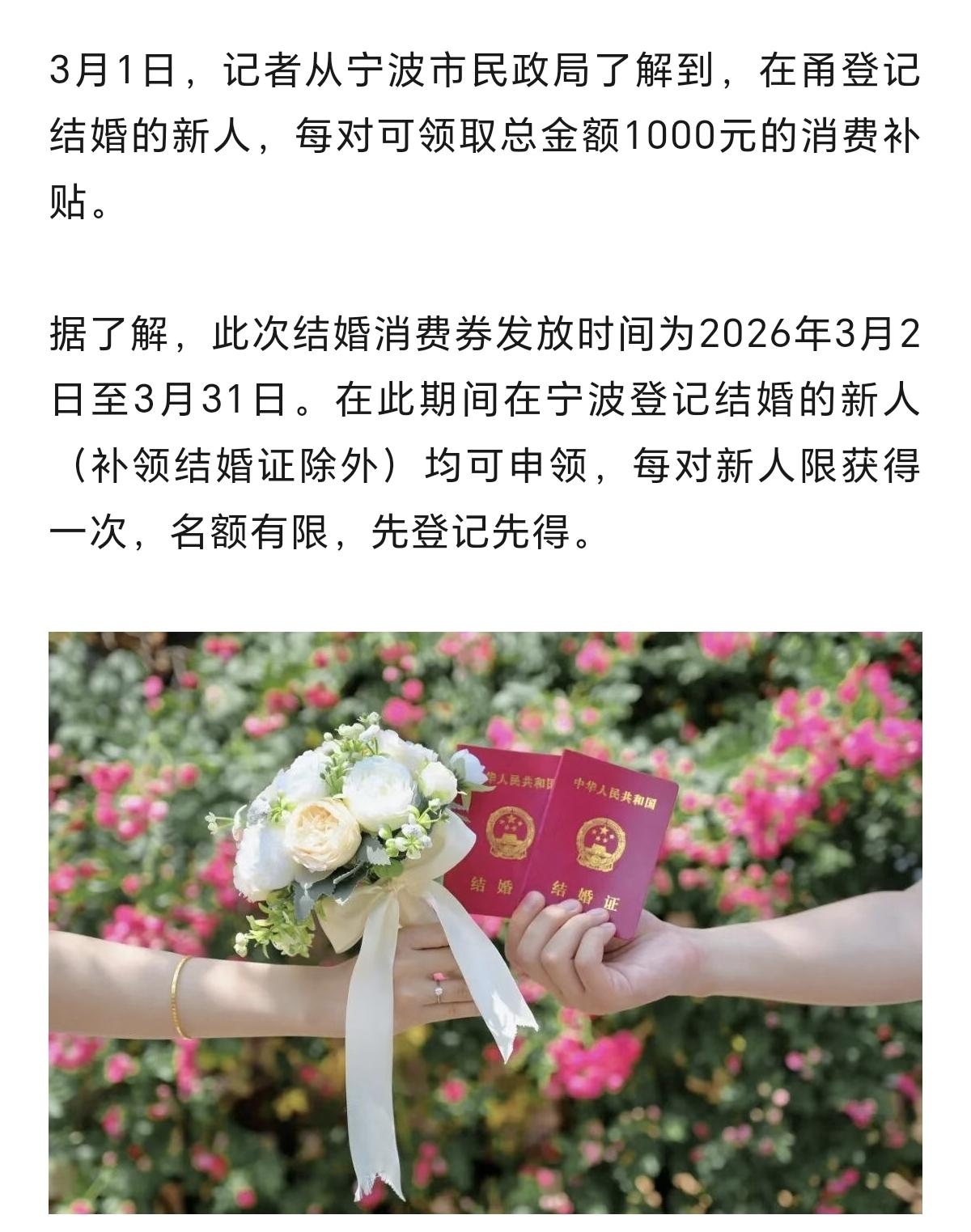 这个挺好,在宁波登记结婚的新人,还可以领取价值1000元的消费券。时间为2026年3月1日至3月31日。每对新人,可获得8张满500减125元的消费券机会。 这个结婚,可领取消费券的福利,也是一种创新。也是给在宁波各县市区,登记结婚的新人,一份礼包,一个祝福。本月有意向登记结婚的新人们,正好可以增添一份惊喜,一个好彩头。 新闻来源:宁波晚报(详情可以阅读下方图片截图)。