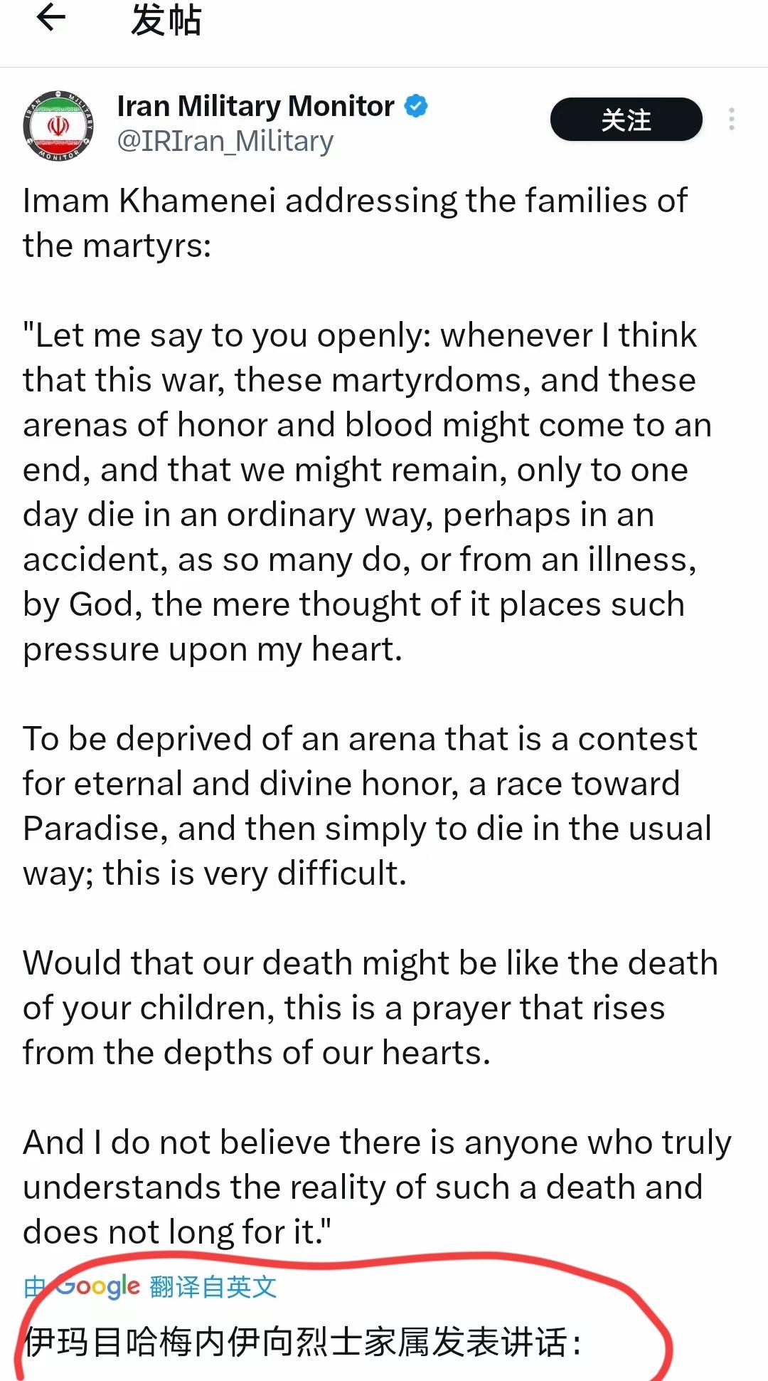 哈梅内伊殉道,践行了他的生死观。 先前他在接见烈士亲属时已明确表达了对死亡意义的解读,其中固然有宗教信仰的因素,但我相信这也是他真实想法。 形势如此严峻,危险时刻降临,一个老人殉职在工作岗位上,值得人称道。 司马迁两千年前对于死亡的“重于泰山”或“轻于鸿毛”的阐释,与哈梅内伊殉道不谋而合。