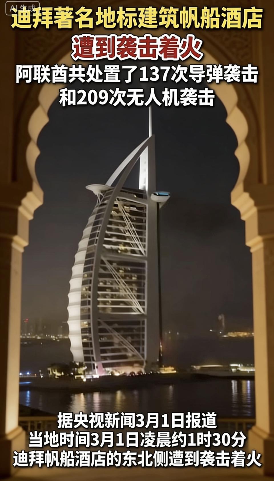 奢华地标帆船酒店的宁静夜空被火光撕裂,当地时间3月1日凌晨约1时30分,其东北侧突遭袭击起火。据央视新闻报道,近期阿联酋已累计处置137次导弹袭击与209次无人机袭击,和平的宁静在冲突阴影下显得愈发脆弱。