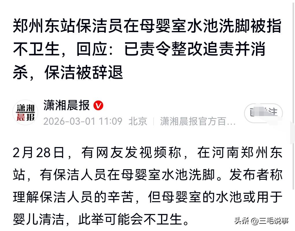 这大妈的意识还差了点,竟然在母婴室的洗手池泡脚。 近日,郑州东站保洁员在母婴室水池洗脚被指不卫生,官方回应:已责令整改追责并消杀,保洁被辞退。 大妈怎么也不会想到就因为干了这个事被辞退了。 所以说这个意识很重要啊。 这毕竟是母婴室的水池啊,要是有什么细菌让宝宝感染了就麻烦了。 保洁被辞退了一点也不冤。