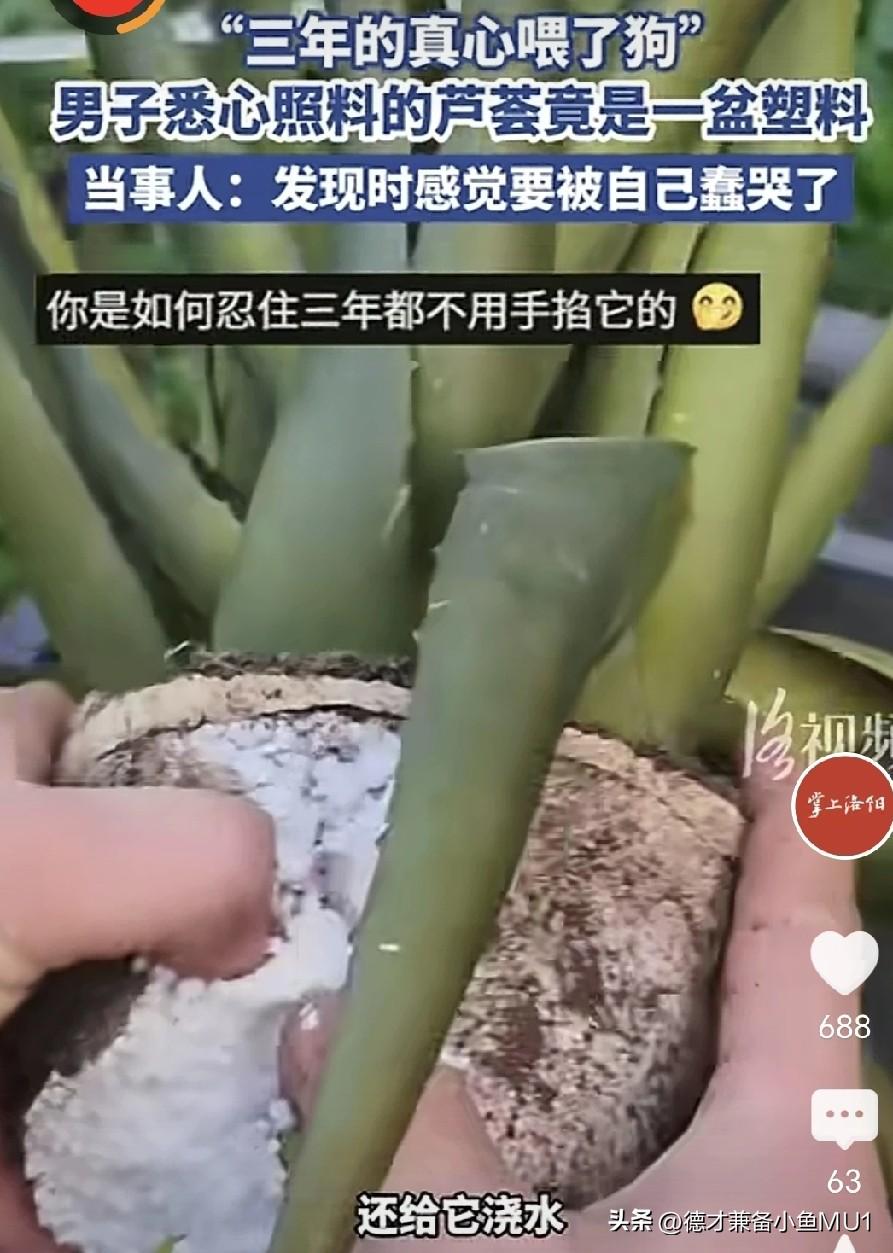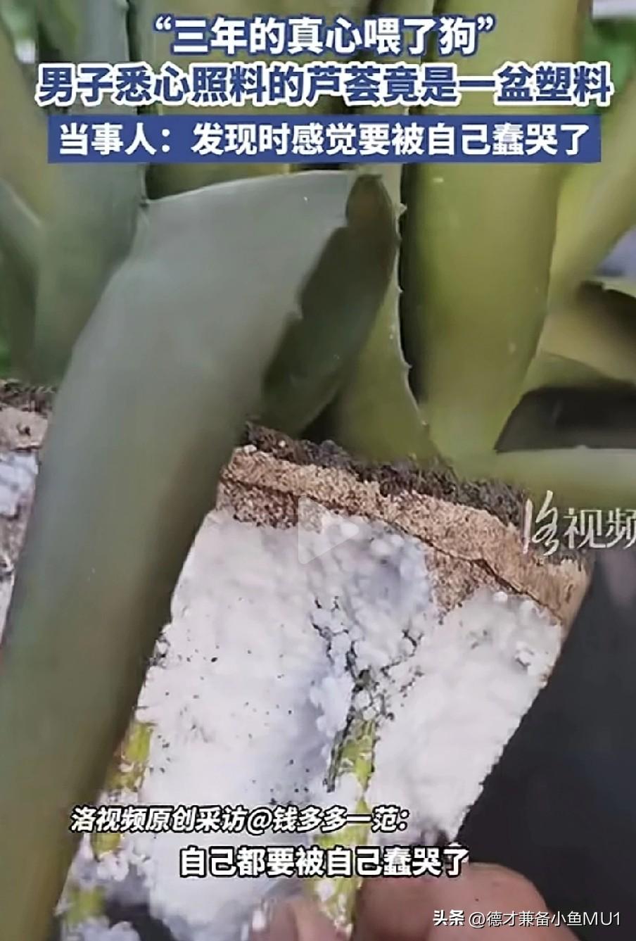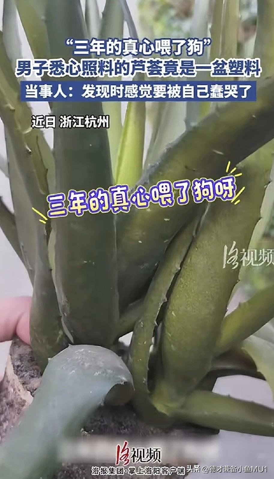 男子三年前在夜市买了一盆芦荟花,带回家后悉心照料,又是浇水又是施肥,没想到这竟是一盆塑料花。他可真是个“人才”,三年里芦荟既没有叶子枯萎发黄,也没长出新叶子,他就没起过疑心吗? 直到看见花盆开裂,他才想着给芦荟换个盆、松松土,这才发现芦荟是塑料的,还插在泡沫上。男子被自己的愚笨逗笑了,不禁感慨三年的真心都喂了狗了。
