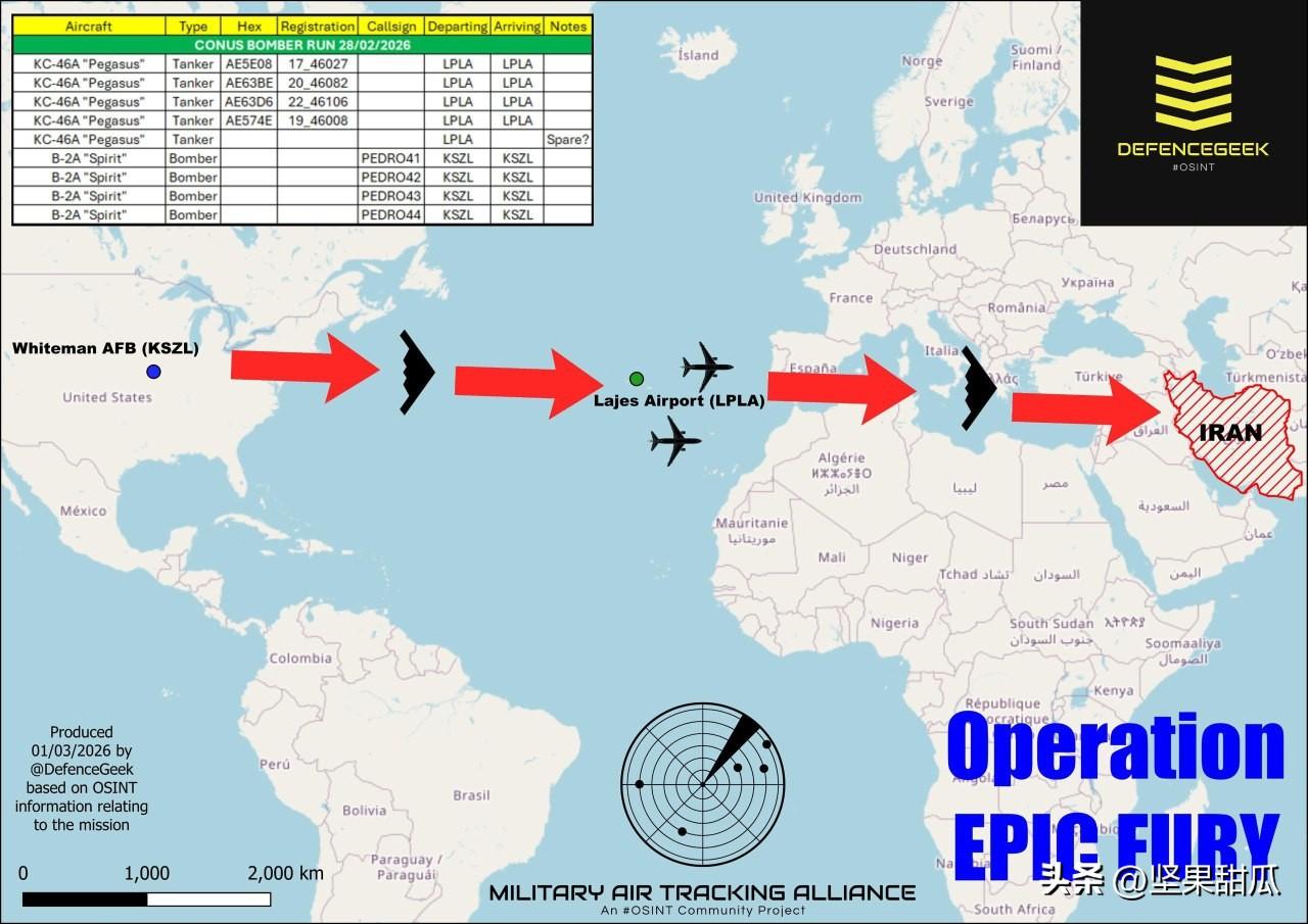 美国B2也怕了, 2.28日晚,四架B-2A“幽灵”隐形轰炸机偷偷摸摸从美国直飞伊朗,执行“史诗狂怒行动”,投完弹就赶紧跑了,目前 轰炸机已飞越战区,正在返回大西洋。 这些美国佬也是怕了,不敢出动太多,也不敢搞太大阵势,深怕被伊朗防空给惦记上。