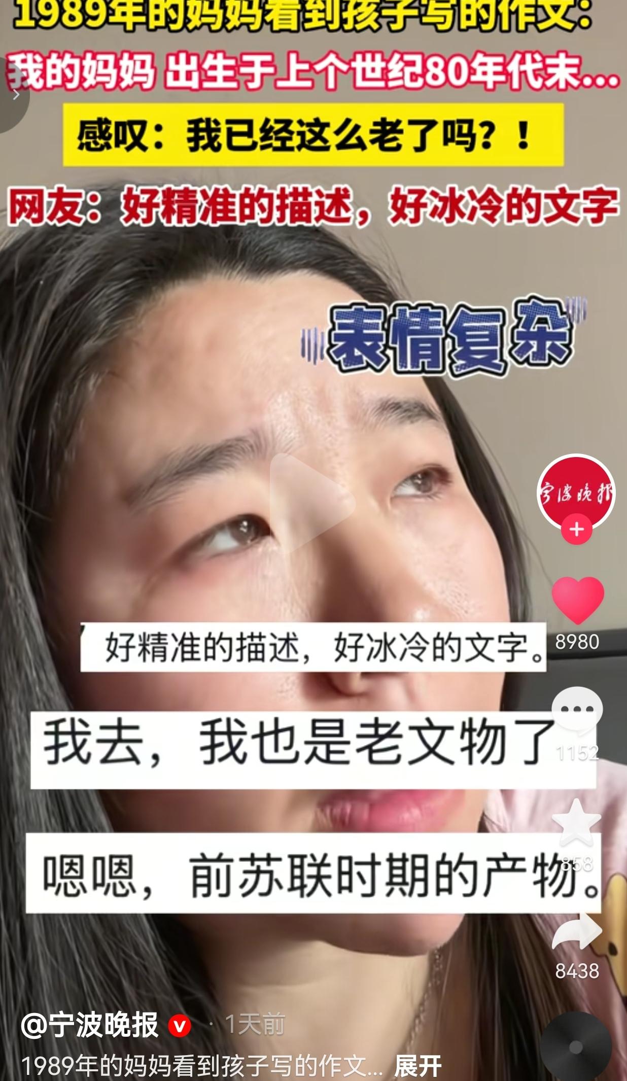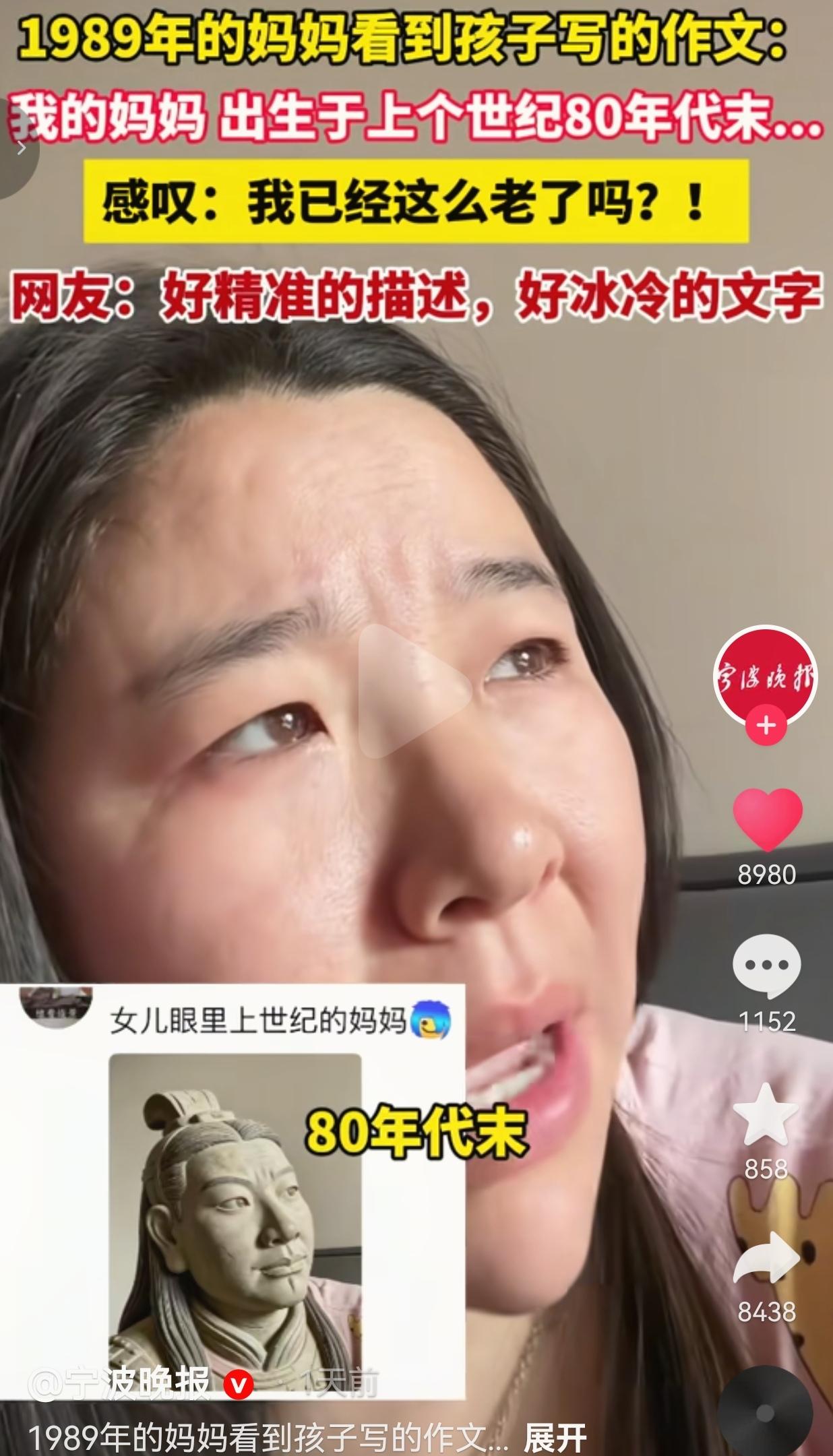 孩子说的一点都没有错,只不过文字说的太过于精准而已!最近河南一女子有点emo。 为什么会这样呢?原因是几天前,她翻儿子的作文本,作文的题目是《我的妈妈》。 前面写得都挺正常,直到她看到那句:“我的妈妈,出生于上个世纪80年代末…” 女子看到后当场愣住,对着镜头哭笑不得:“我是1989年的啊!今年才三十多岁,我从来没想过我有多么老多么老,直到我看见我家孩子写的作文……” “上个世纪”这五个字,像一把精准的小刀子,一下就扎在了她的心口上。 她对着镜头翻了个白眼,又好气又好笑:“我这才三十多岁啊,怎么在我儿子眼里,我就成了‘上个世纪’的人了?感觉自己像个兵马俑似的。” 这事在网上一发酵,网友们都笑疯了,有的网友说:“好精准的描述,好冰冷的文字。” 也有的网友说:“我也是89年的,我儿子上次说我是‘古代人’,我当场就想给他报个历史补习班。” 还有的网友说: “代入感太强了,我已经开始emo了。我明明还觉得自己是个宝宝,怎么就成了上个世纪的人了?” 说实话,我看到这个视频的时候,也跟着笑出了声,但笑着笑着,心里也咯噔了一下。 我们这代人,好像一直都活在“还没长大”的错觉里。小时候,我们听着“80后是垮掉的一代”长大。后来,我们又成了“90后是叛逆的一代”。 我们总觉得自己还年轻,还能折腾,还能和生活掰掰手腕。 可一转眼,我们的孩子已经开始用“上个世纪”来定义我们的出生年份了。时间这个东西,真的太狡猾了。它从来不会大声宣告“你老了”,而是偷偷藏在孩子的作文里,藏在眼角的细纹里,等你反应过来的时候,才发现,原来自己已经走了这么远。 女子说,她以前总觉得“上个世纪”是爷爷奶奶辈的专属词汇,是黑白照片里的故事,是历史课本里的章节。 可现在,这个词,安在了自己身上。这种感觉,就像你昨天还在追着《还珠格格》喊“小燕子”,今天你的孩子已经在问你:“妈妈,你小时候是不是没有手机啊?” 但转念一想,“上个世纪”的妈妈,又何尝不是一种勋章呢? 我们经历过没有智能手机的童年,我们在小卖部里攒过干脆面的卡片,我们在课间和同学传过小纸条,我们在网吧里为了偷菜定过凌晨的闹钟。我们的青春,是MP3里的周杰伦,是租碟店里的《流星花园》,是放学路上的夕阳和自行车后座的笑声。 这些“上个世纪”的记忆,恰恰是我们最宝贵的财富。它让我们懂得什么是慢,什么是真,什么是不用滤镜也很美的生活。孩子眼里的“上个世纪”,其实是我们独一无二的黄金时代。 大家觉得呢?欢迎大家评论区讨论留言。