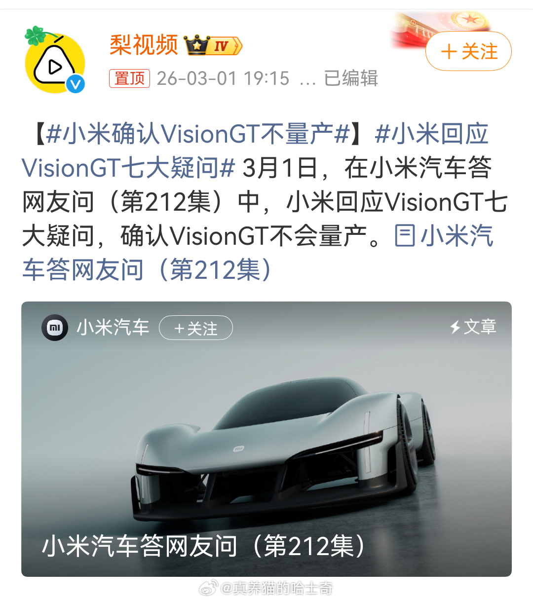小米确认VisionGT不量产 还等着开卖呢,看看能不能再创个记录。结果不量产。