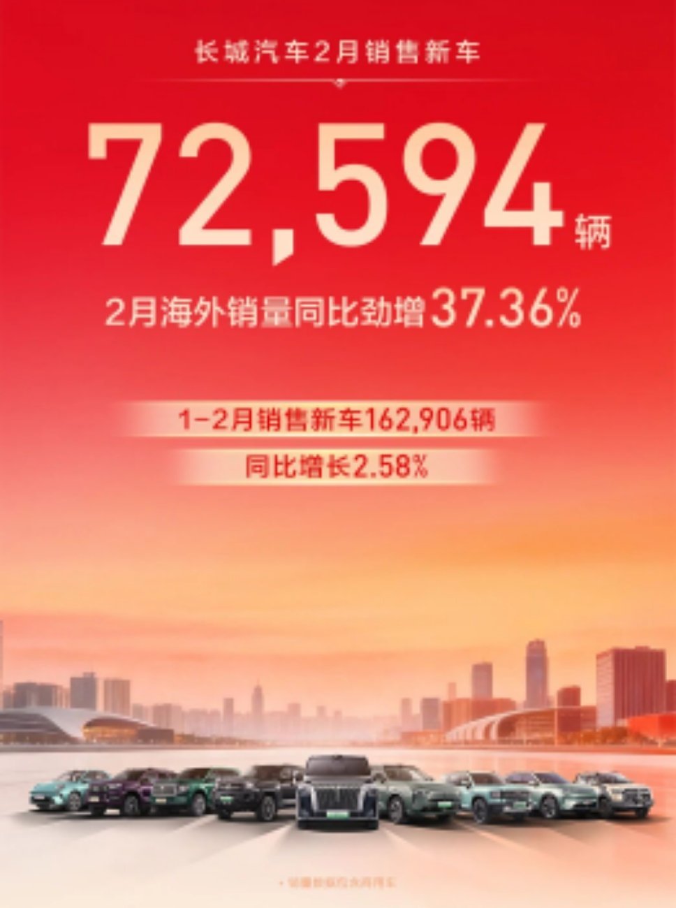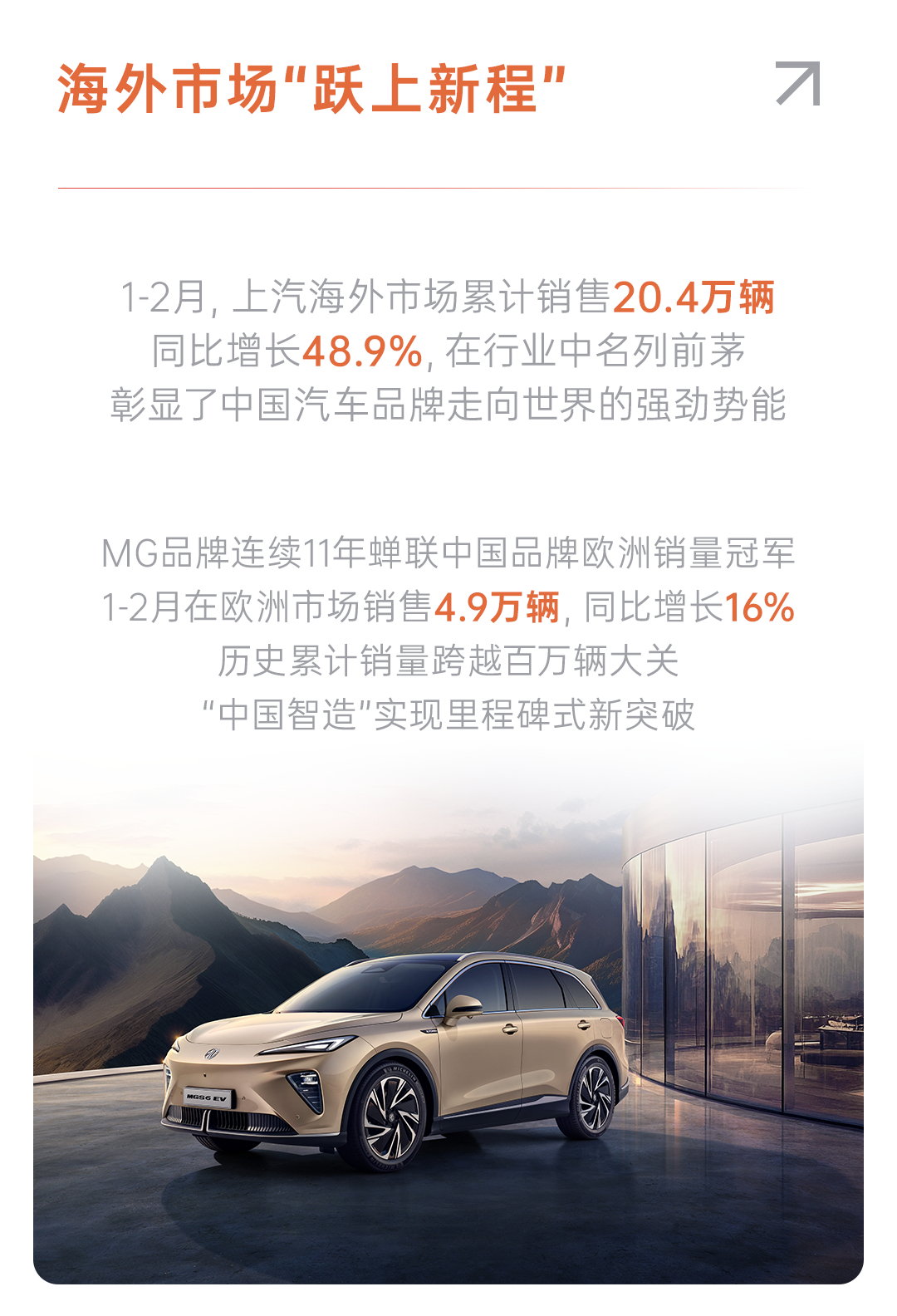 1. 奇瑞:集团出口124,929辆,同比增长41.5%,连续10个月单月出口突破10万辆,累计出口600万辆中国品牌第一,创造中国品牌车企首个“出海600万”;2. 比亚迪:乘用车及皮卡海外销售(出口)100151辆 ,同比增长41.4%;3. 吉利:海外出口销量60,879辆,同比增长138%;4. 长城:海外销量同比劲增37.36%;5. 上汽:海外市场销售9.9万辆,同比增长48.9%,MG品牌连续11年蝉联中国品牌欧洲销量冠军,1-2月在欧洲市场销售4.9万辆,同比增长16%,历史累计销量跨越百万辆大关。