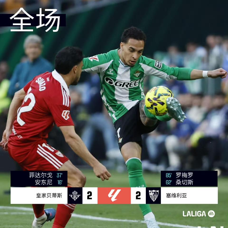 全场|皇家贝蒂斯 2-2 塞维利亚 ⚽️16' 安东尼门前补射倒钩首开纪录,1-0。 ⚽️37' 阿布德直塞菲达尔戈中路破门扩大比分,2-0。 57' 阿布德头球高出。 ⚽️62' 桑切斯头球破门为塞维利亚扳回一分,2-1。 ⚽️85' 伊萨克禁区中路劲射扳平比分,2-2。 塞维利亚德比 双方各取一分。