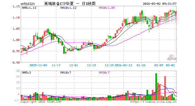 3月2日,高端装备ETF华夏(516320)开盘跌1.69%,报1.104元。高端装备ETF华夏(516320)重仓股方面,宁德时代开盘跌0.30%,阳光电源跌1.67%,中国船舶涨0.93%,汇川技术跌1.60%,三一重工跌0.65%,特变电工跌1.25%,隆基绿能跌1.91%,徐工机械跌1.39%,思源电气跌0.40%,潍柴动力跌1.29%。