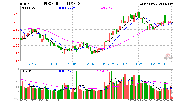 3月2日,机器人ETF国泰(159551)开盘跌1.21%,报1.385元。机器人ETF国泰(159551)重仓股方面,科大讯飞开盘跌1.90%,汇川技术跌1.60%,拓普集团跌2.68%,大华股份跌1.56%,大族激光跌1.80%,双环传动跌2.51%,石头科技跌1.00%,中控技术跌2.74%,绿的谐波跌3.60%,机器人跌2.40%。