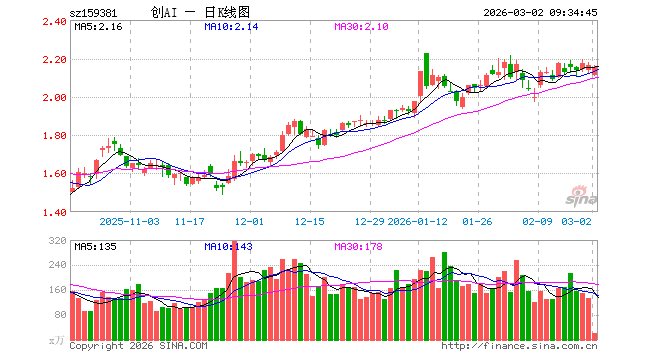 3月2日,创业板人工智能ETF华夏(159381)开盘跌2.49%,报2.111元。创业板人工智能ETF华夏(159381)重仓股方面,新易盛开盘跌3.37%,中际旭创跌2.62%,天孚通信跌0.50%,蓝色光标跌4.86%,协创数据跌1.69%,同花顺跌2.05%,润和软件跌5.47%,北京君正跌2.40%,润泽科技跌0.87%,昆仑万维跌1.62%。