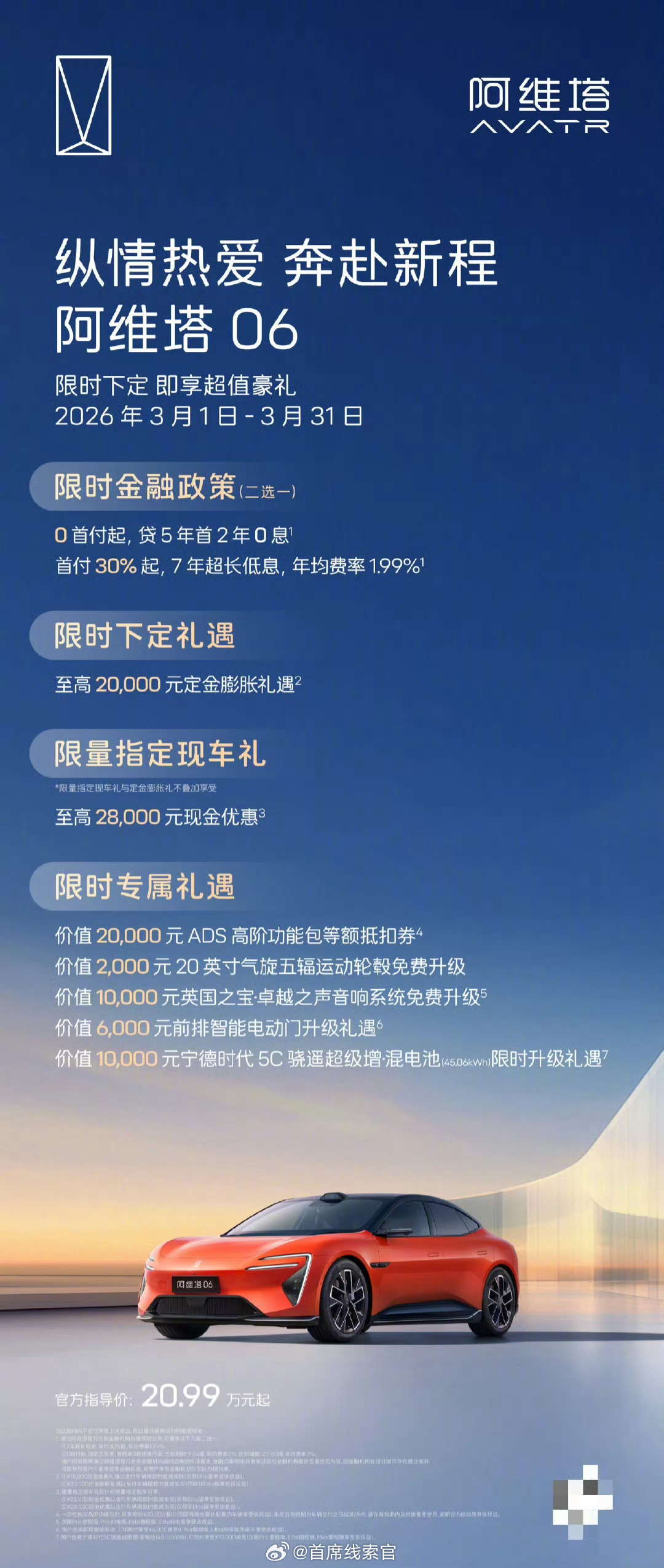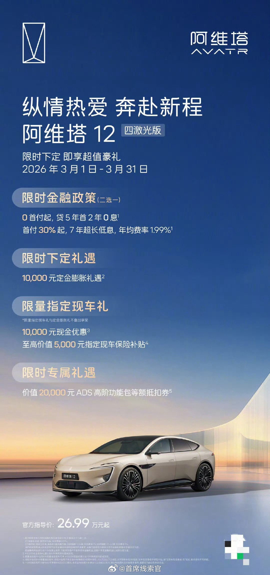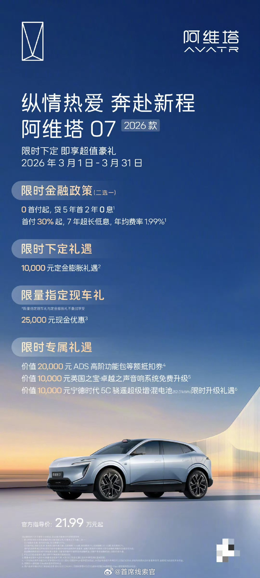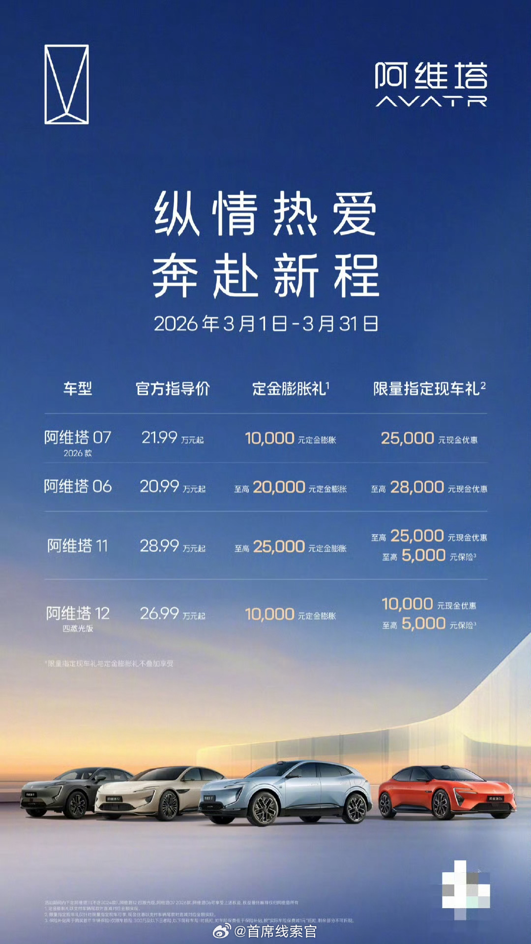 阿维塔公布 3 月购车权益,0 首付 / 7 年低息双金融方案可选,涉及多款车型。