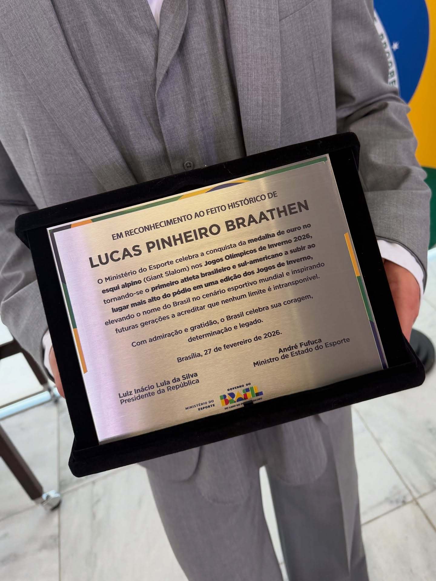 卢卡斯·皮涅罗获巴西国家表彰冬奥会 为巴西夺得历史首枚冬奥会金牌的高山滑雪运动员卢卡斯·皮涅罗,今日在巴西利亚接受国家荣誉牌匾,以表彰其在2026年米兰-科尔蒂纳冬奥会上的历史性突破。在冬奥会高山滑雪男子大回转项目中,卢卡斯为巴西及南美洲斩获首枚冬奥金牌,打破了“热带国家无缘冰雪巅峰”的刻板印象。由巴西总统卢拉与体育部长富富卡颁发的牌匾上写道:“他将巴西的名字推向世界体育舞台更高处,激励下一代相信没有极限不可逾越。”卢卡斯表示:“这枚金牌属于所有人。我们的力量源于差异,当我们相信自己,一切皆有可能。”此次表彰不仅是对个人成就的肯定,更标志着巴西冰雪运动迈入新纪元。此刻皆不凡