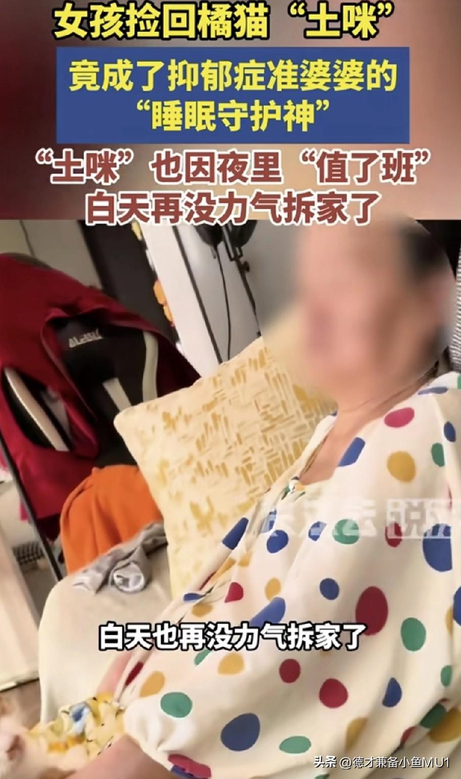 女孩在地下停车场看到一只流浪猫,它模样可怜,无人照管。女孩心生怜悯,便把小猫带回了家,还给它取名叫土咪。她给土咪洗了澡,又买了好多玩具。来到新家的土咪精力充沛,天天拆家。 一个多月后,女孩把因抑郁症住在养老院的准婆婆接回了家。神奇的是,土咪每晚都守在准婆婆身边,默默守护,寸步不离。准婆婆睡眠安稳了,情绪也有所好转。土咪夜里“值班”,白天就没精力拆家了,形成了完美闭环。 小猫小狗确实能安抚人的情绪。我有时心情烦躁,跟狗狗玩一会儿,闻闻它那有点香又有点臭的混合味道,情绪就会平静下来,注意力也会转移。这真的有助于抑郁症和焦虑症患者康复。所以,人可以享受孤独,但不能一直孤独。家里得有点动静,要么有人,要么有宠物。不然,一个人待久了真会抑郁。抑郁症患者需要有人陪伴,给予情绪反馈,土咪正好满足了这一点。 老话说“猫守魂”,当人心神不宁时,猫真能帮人守护魂魄。有次儿子和老公吵架,儿子气得直哭。这时,神奇的一幕出现了,家中养的三花猫围着儿子,急得轻轻咬他的脚,一边咬一边轻声叫唤。接着,它顺着儿子的脚咬到腿,又咬到胳膊,最后咬到他的手,始终一边咬一边叫。我和老公一直在旁看着,很快孩子就平静了下来。(我所说的“咬”并非咬出血,只是轻轻含住,养过动物的人都懂,别误解)当时我就觉得猫真是神奇。
