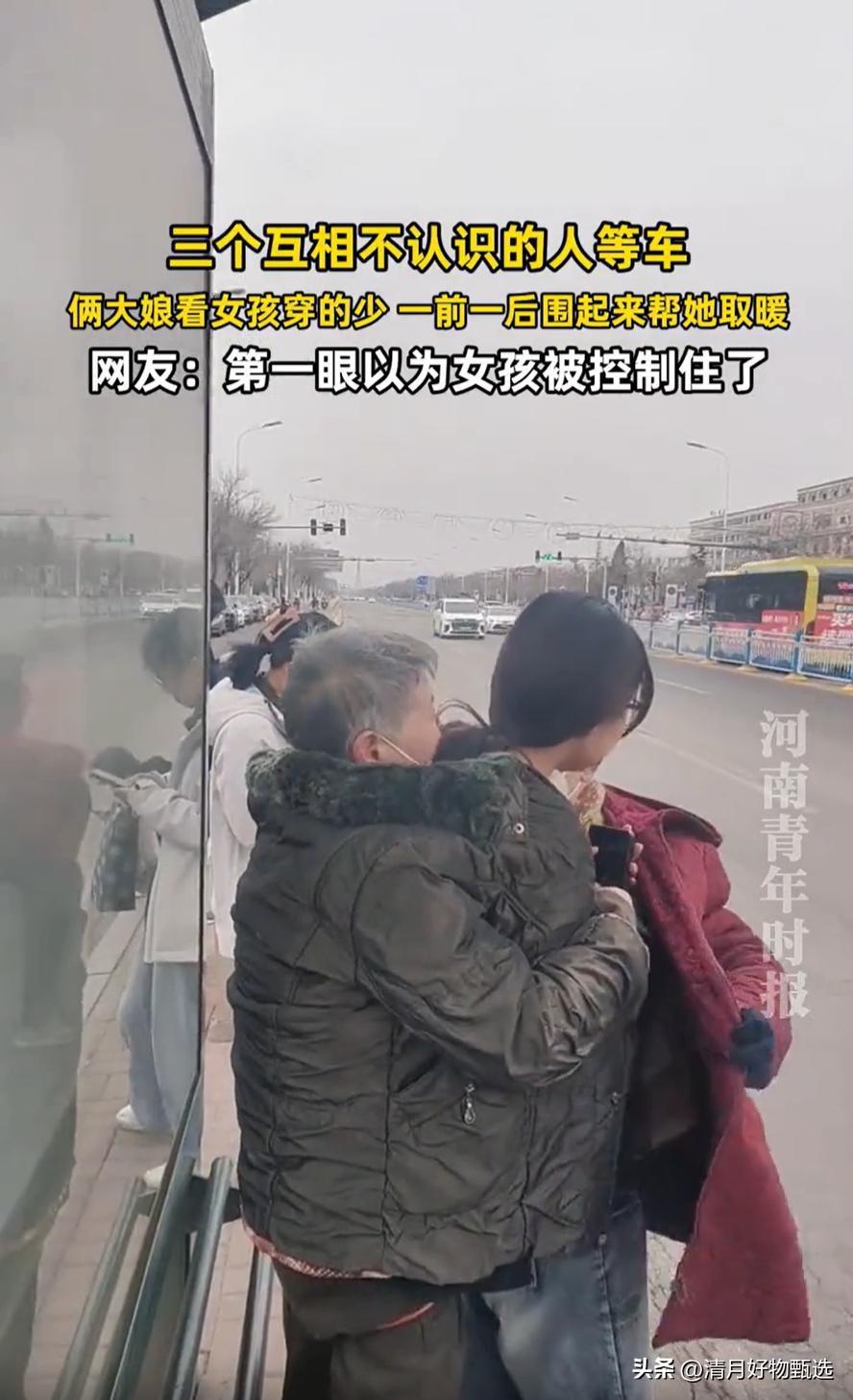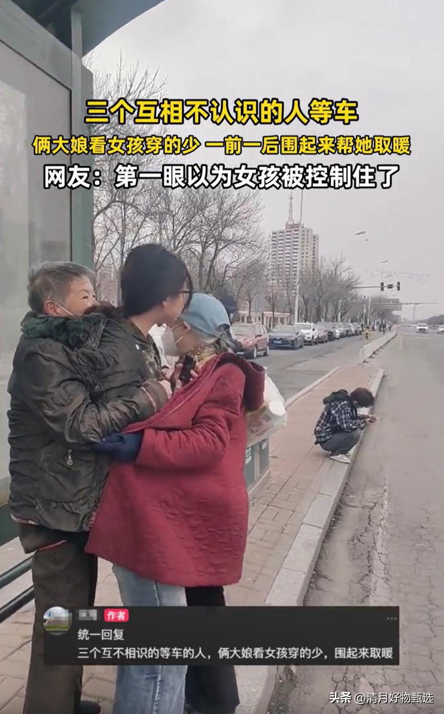 俩大娘看女孩穿得少,一前一后帮取暖!这温馨一幕瞬间暖哭全网! 事情发生在一个寒冷的冬日早晨。街头,一位年轻女孩因为赶时间,穿得单薄,明显抵挡不住刺骨的寒风。 正当她瑟瑟发抖时,路过的两位大娘注意到了她的窘境。没有多说一句话,两个大娘一个站在女孩前面,一个站在后面,轻轻地用自己的身体为她挡风取暖。她们用行动传递着最朴实的关怀和温暖,仿佛一股暖流瞬间融化了寒冷,也温暖了路人的心。 这幅画面被路人拍下并分享到网络后,迅速引发热议。网友们纷纷感叹:“这才是人间真情!”“岁月静好,皆因有人温暖守护。”不少人留言说,正是这些无声的善意,才让这个世界变得更加温暖和美好。 透过这简单却感人的场景,我们看到了人性中最柔软的一面。现代社会节奏快,人与人之间的冷漠似乎在加剧,但正是这样一份无私的关怀,让我们重新相信善良和温情的力量。 两个素不相识的老人,用最朴实的方式诠释了“邻里守望”的真谛,也提醒我们:关爱不需要华丽的语言,只需一颗真诚的心。 这件小事背后,是对社会温情的呼唤。每个人都可能成为那个“取暖”的人,也可能是需要被“取暖”的那一个。我们都希望,在寒冷的日子里,有人愿意为我们挡风遮寒。 你是否也曾被陌生人的善意感动?或者你愿意成为那个温暖别人的人?欢迎在评论区分享你的故事,让这份温暖继续传递下去。因为,世界需要更多这样的“取暖者”。