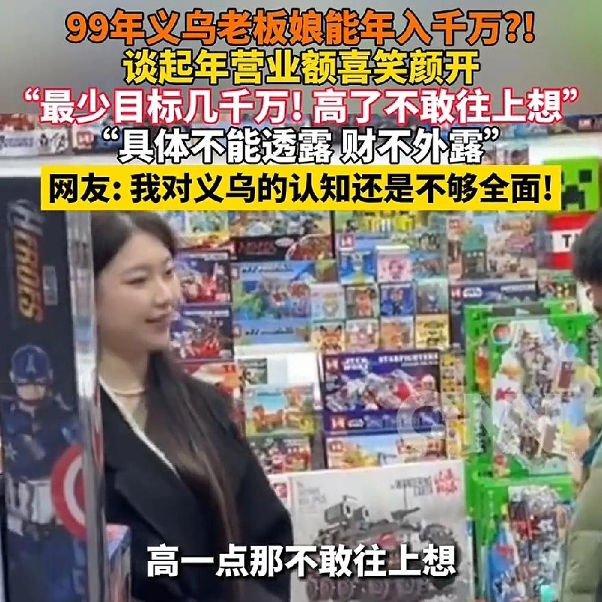 谁能想到, 99年的义乌老板娘, 张口就是“年营业额最少几千万”,这底气,真不是一般人能有的。 2月28日义乌商贸城开市首日,这位从潮汕来做玩具生意的老板娘。 被问起去年营收时笑得合不拢嘴,一句“财不外露”,却又忍不住说“高了不敢往上想”,把义乌的造富神话又推上了热搜。 很多人酸她吹牛皮,但在义乌,这真不是夸张。 这里的商铺,卖的不是单件,是集装箱;赚的不是差价,是规模。 年轻人别总盯着“躺平”,义乌的老板娘们,早就用行动证明:敢闯、敢拼、敢抓住风口,才是这个时代最硬的底气。 别再以为义乌只是卖小百货的地方,这里藏着无数普通人逆袭的可能。你觉得义乌的生意真有这么好做吗?义乌商业指数 义乌女商人 义乌经验 义乌饰品辅料 湖南义乌市场 义乌好逛美女 义乌女装实体