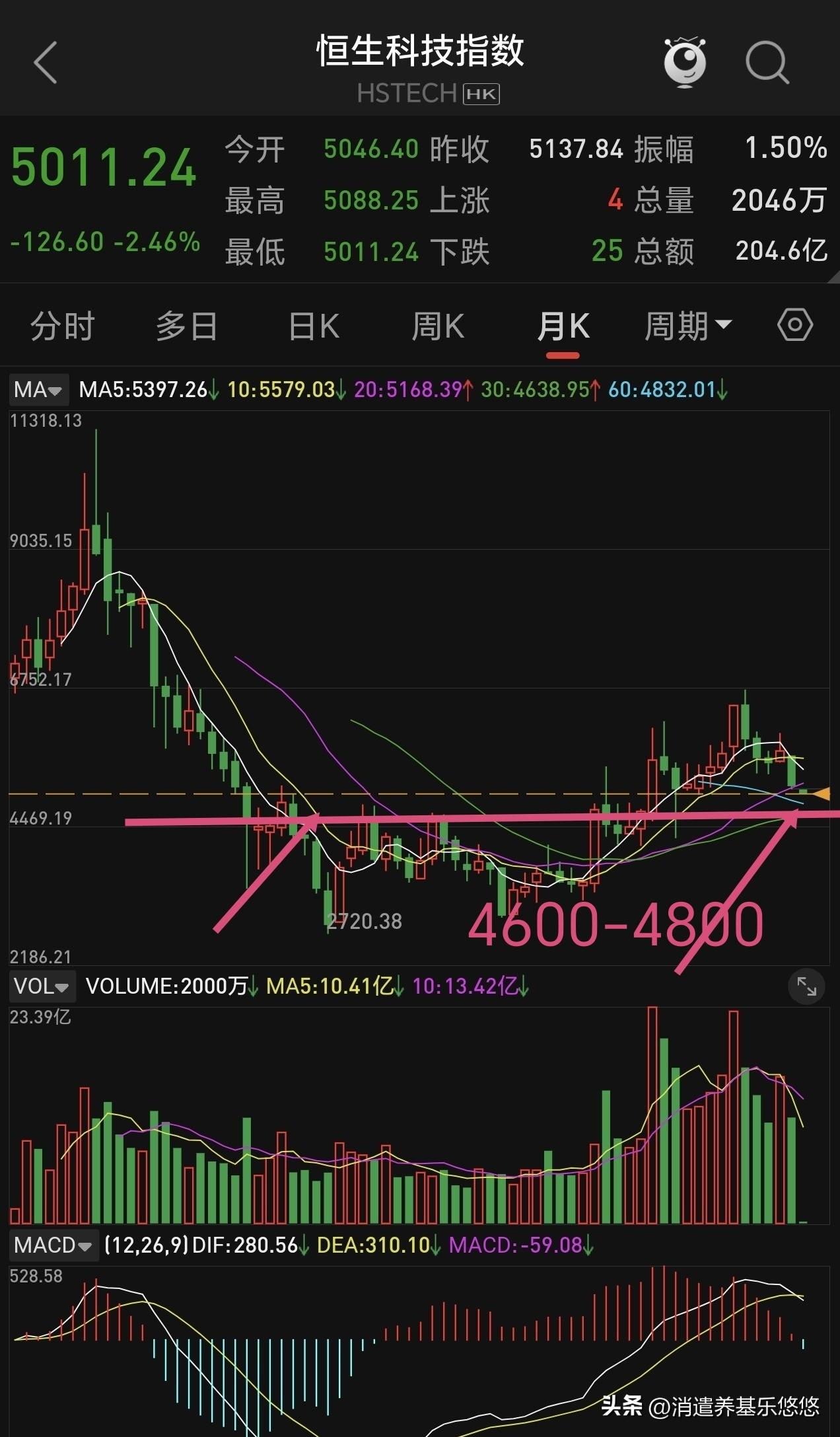 恒科基本上按照本人预测趋势运行,上周提示了,近期奔5000点,今天就到了,从它的月线走势分析(如下图所示),下一个目标就是4800点---4600点,4600点左右是比较舒服的介入点位,本人计划到时候再出手,目前就是看戏等待,也许途中有反弹,但是,中途反弹一下还会继续寻找支撑。这个板块不能玩短线,只能做长线,否则难赚钱。 个人观点仅供参考,不构成投资依据。点赞转发评论关注,投资理财不迷路。