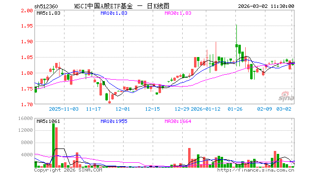 3月2日,截止午间收盘,MSCI中国A股ETF基金(512360)跌0.82%,报1.824元,成交额5.17万元。MSCI中国A股ETF基金(512360)重仓股方面,贵州茅台截止午盘跌1.10%,宁德时代跌1.03%,招商银行跌0.05%,工业富联跌0.70%,中国平安跌1.08%,紫金矿业涨0.68%,长江电力涨2.04%,中际旭创涨6.74%,农业银行涨1.87%,寒武纪跌0.00%。