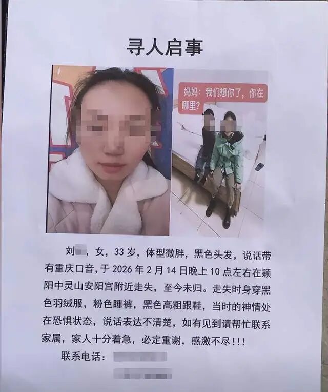 根据家属发布的寻人启事,刘某,女,33岁,体型微胖,黑色头发,说话带有重庆口音,于2026年2月14日晚上10点左右,在颍阳镇中灵山安阳宫附近走失,至今未归。走失时身穿黑色羽绒服,粉色睡裤,黑色高粗跟鞋。刘某当时的神情处在恐惧状态,说话表达不清楚。如有见到请帮忙联系家属,家人十分着急,必定重谢,感激不尽。
