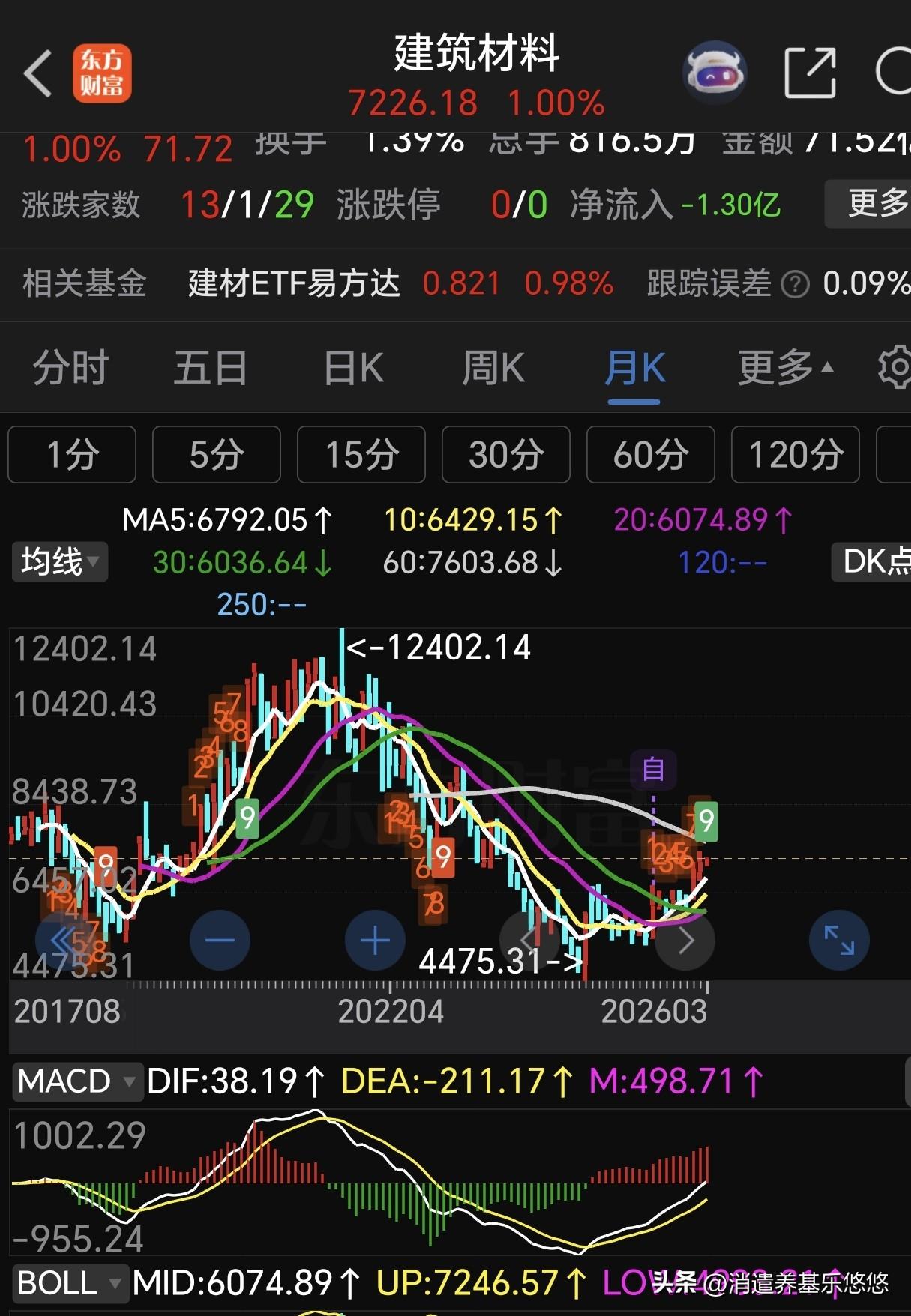 这个板块在偷偷上涨📈,大家都不怎么关注它,目前已经完成日线级别的突破,板块指数创新高,月线目前还在大底部,长期上涨空间还比较大。日线周线月线都是上行趋势,它属于老登板块,今年老登板块不可忽视,科技板块涨幅过大,建材基建还有高铁板块,也许会给你带来财富。建材板块代表基金是004857广发建材。 个人观点仅供参考,不构成投资依据,点赞转发评论关注,投资理财不迷路。
