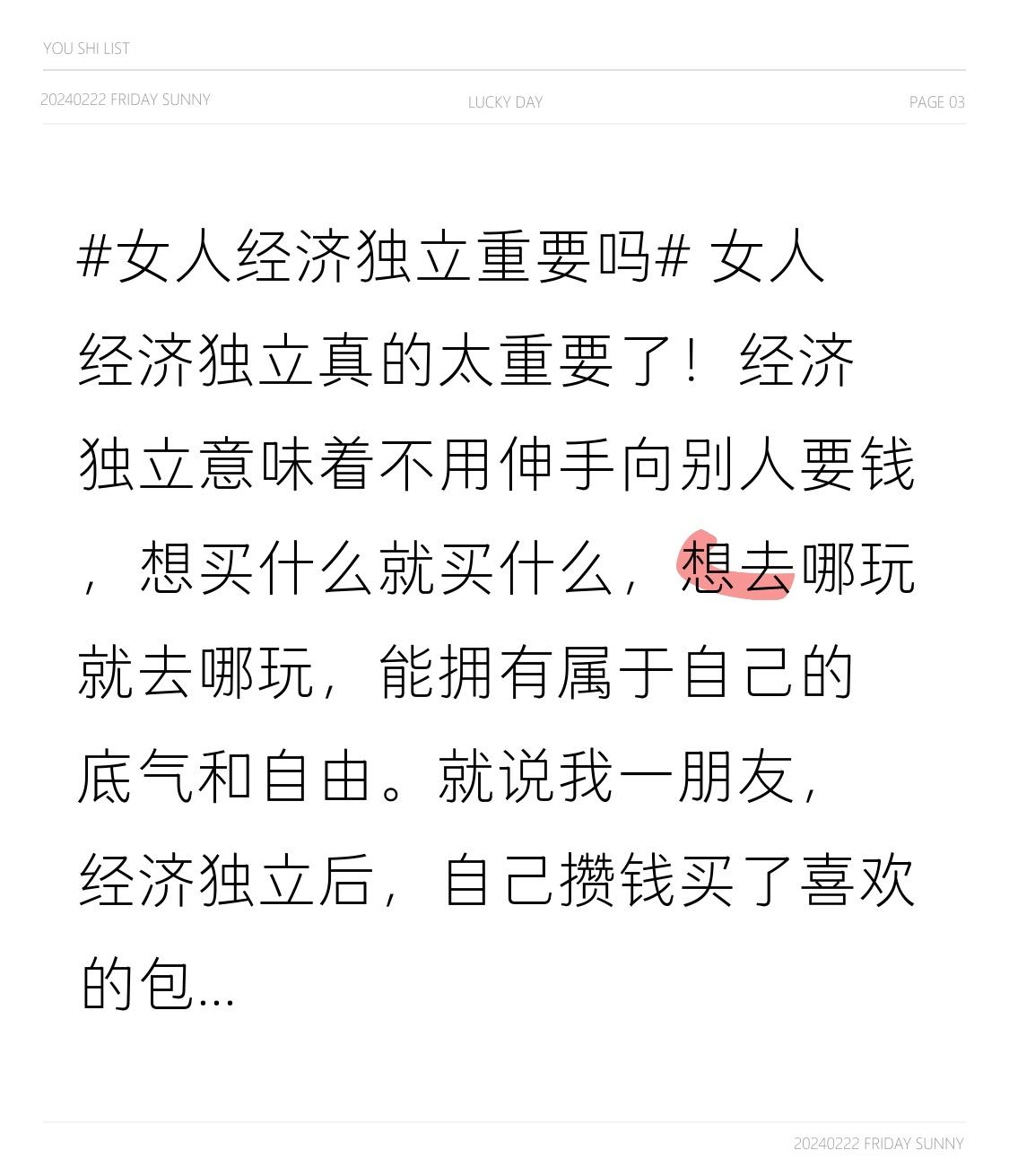 女人经济独立真的太重要了!经济独立意味着不用伸手向别人要钱,想买什么就买什么,想去哪玩就去哪玩,能拥有属于自己的底气和自由。 就说我一朋友,经济独立后,自己攒钱买了喜欢的包包,还去国外旅游了一趟,那日子过得叫一个潇洒。而我呢,唉,还没能实现经济独立。想买件衣服都得考虑半天价格,不敢随意消费。每次看到别人经济独立后自由的模样,心里就特别羡慕。我也得努力加油,争取早日实现经济独立,过上自己想要的生活!