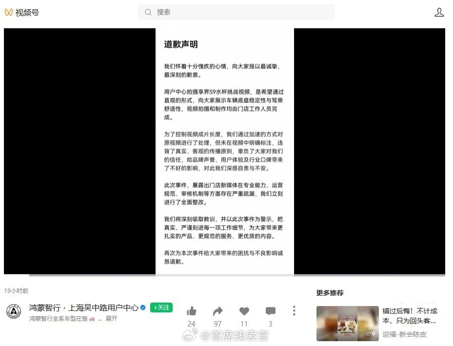 鸿蒙智行已对“门店短视频违规营销”事件作出处罚,包括责令涉事门店限期整改、扣除绩