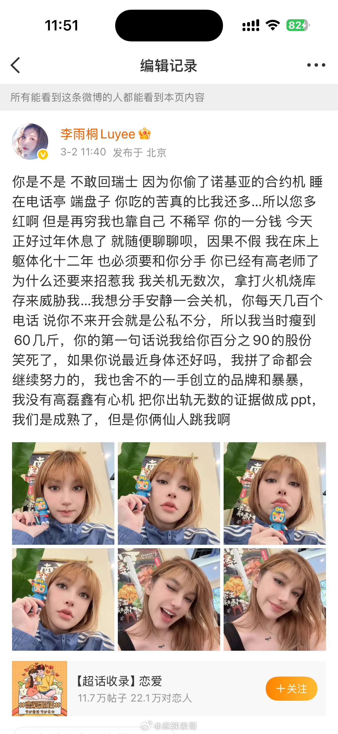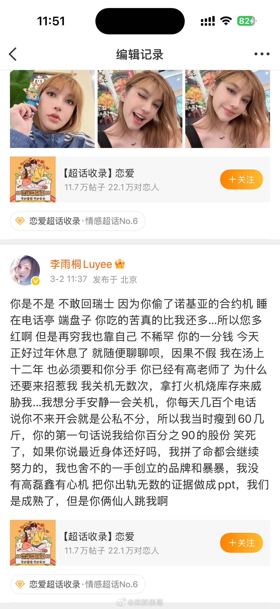 李雨桐喊话薛之谦爆料以后,网友让她补锤,她补了六张自拍之后李雨桐又发文,说自己没