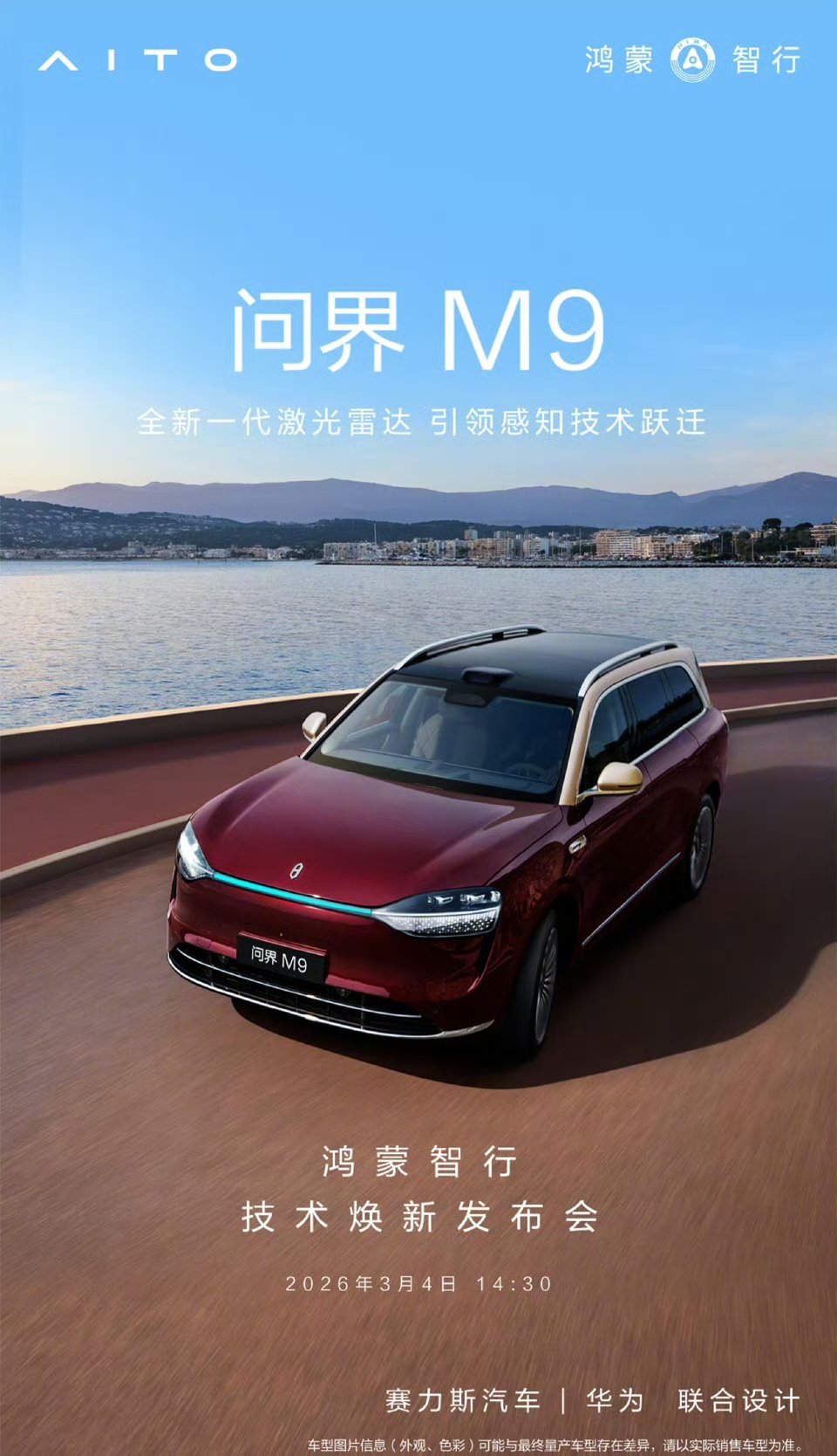 华为终端官方宣布,尊界 S800 和问界 M9 将首发搭载全球量产最高线束激光雷达,主打“超高清、超精准、超远距”(具体信息将在鸿蒙智行技术焕新发布会上揭晓)。
