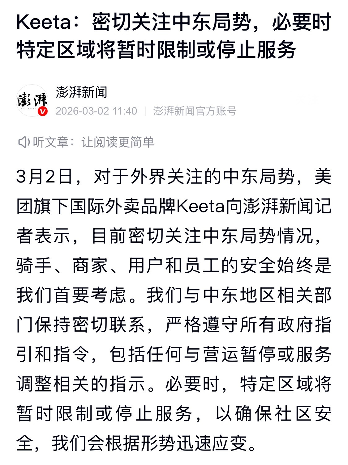 美团已经把生意做到中东了?昨天,一张海外截图被疯传,美团旗下国际品牌Keeta的外卖小哥无惧炮火,仍在中东大街上送外卖,被中国网友称为最美逆行者。