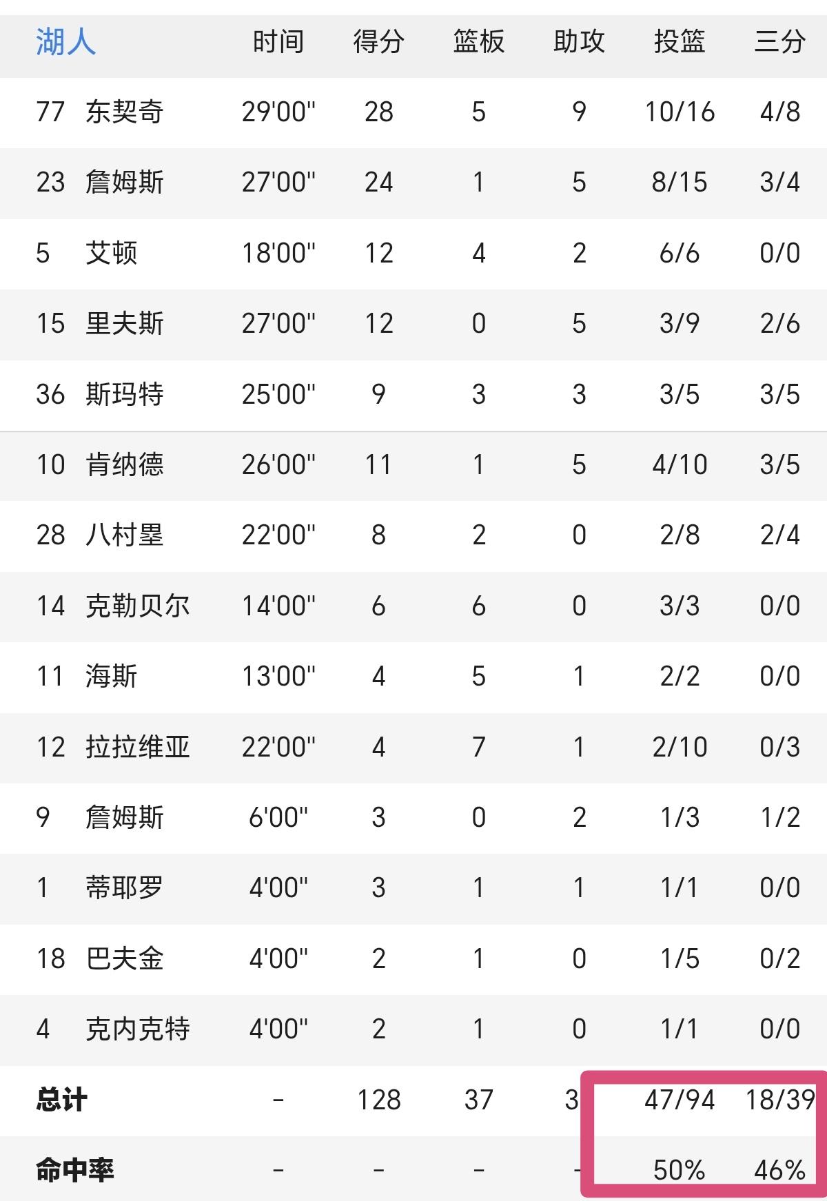 三连败后,湖人迎来两场大胜,一点变化预示着湖人要崛起了。 上一场比赛,湖人129:101狂胜勇士,今天又128:104战胜国王。 湖人两场比赛有几个共同点。 1,没有球员出场超过30分钟。 2,命中率高,都超过50%,三分命中率高达46%。 3,没有球员出手超过20次,这在以往不可想象,东契奇场均出手次数23+。有数据统计,当东契奇出手次数低于20次时,湖人胜率高达80%! 团队篮球才是取胜之道!