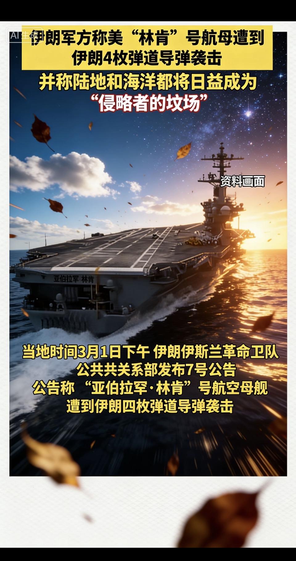 伊朗称4枚弹道导弹袭击美“林肯”号航母,放话海陆皆为“侵略者坟场”。伊朗这一强硬表态无疑在国际局势中扔下了一枚重磅炸弹。此次宣称4枚弹道导弹袭击美“林肯”号航母的消息,瞬间引发了全球的高度关注。 从军事战略角度来看,伊朗有着自己独特的地理优势。其扼守着重要的霍尔木兹海峡,这是全球石油运输的咽喉要道。伊朗放话海陆皆为“侵略者坟场”并非只是空穴来风。在陆地上,伊朗有着广袤的领土和复杂的地形,这为其开展游击战等战术提供了天然的优势。而在海上,伊朗海军虽然在规模和装备上与美国海军存在差距,但他们依靠灵活的小艇战术以及导弹等武器,也能对美国海军构成一定的威胁。